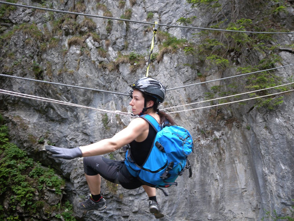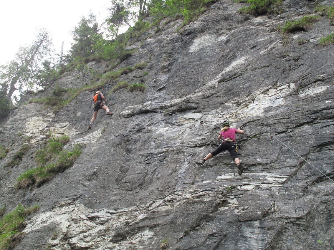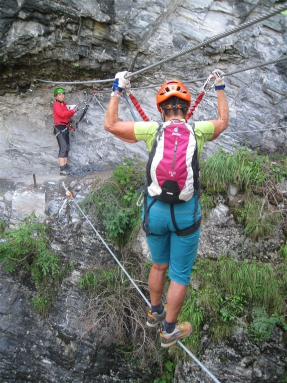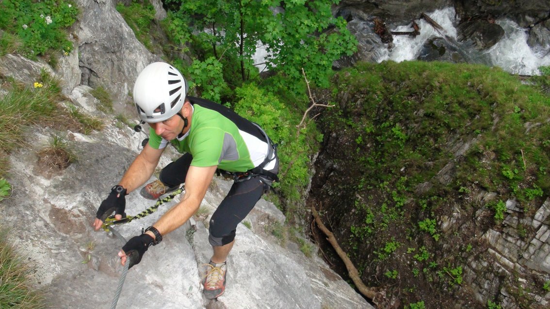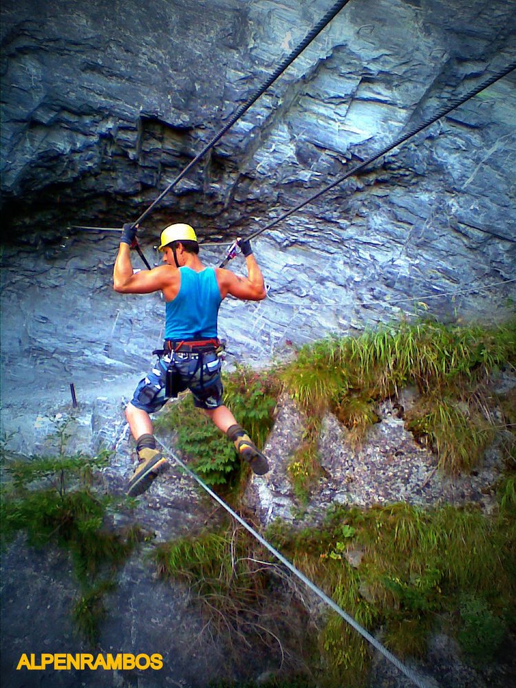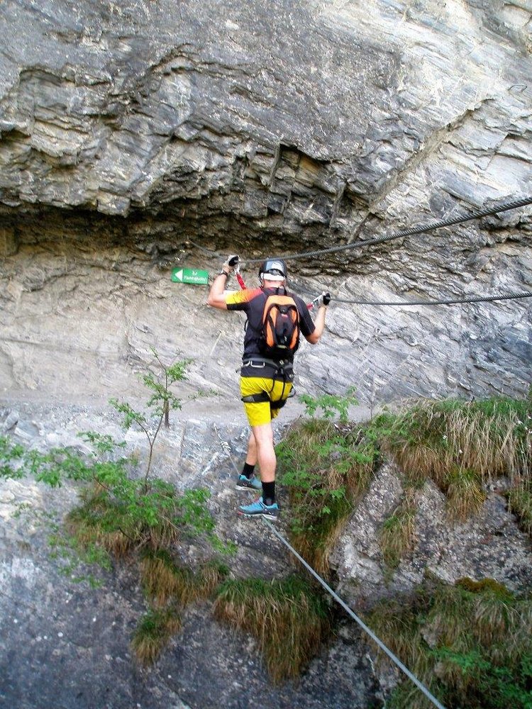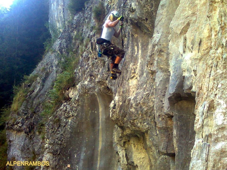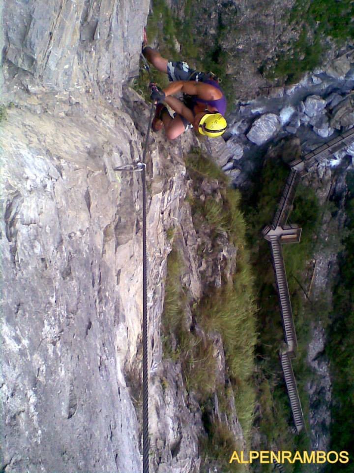 Die restlichen Meter verlaufen im mittelschweren Bereich (C, kurz C/D), aber an einer vertikalen Wand hinunter zum Ausstieg bei der letzten Klammbrücke.