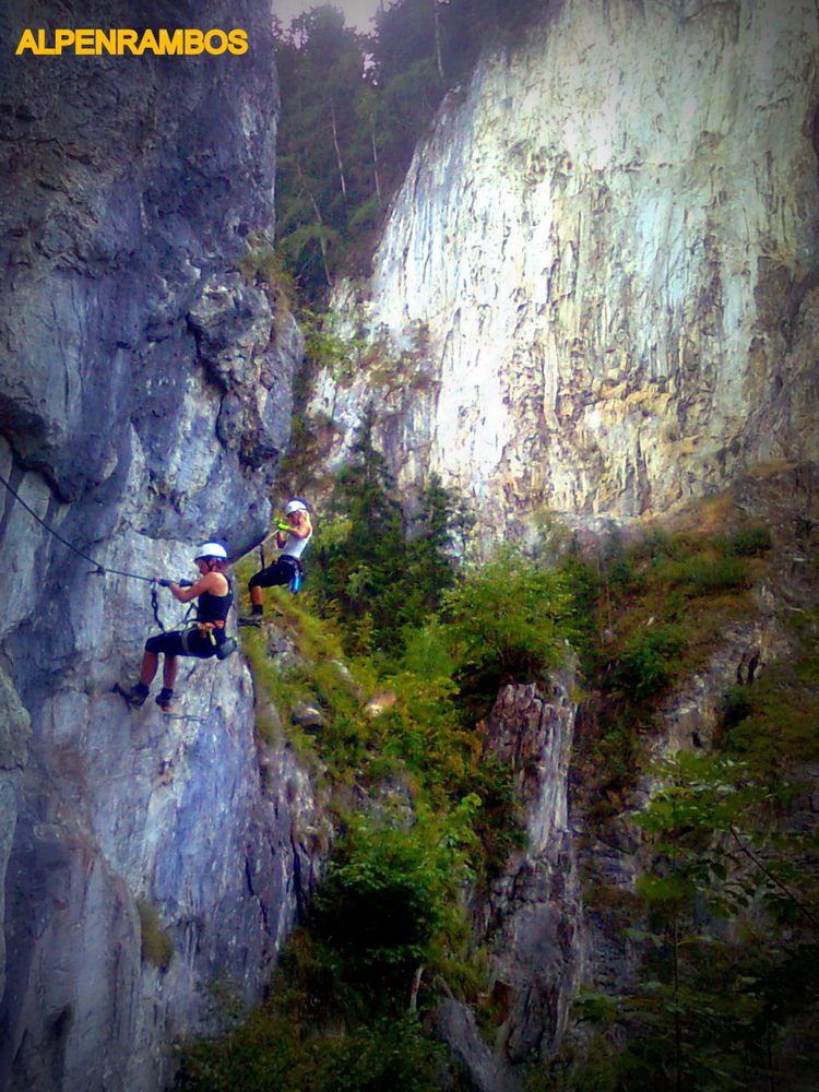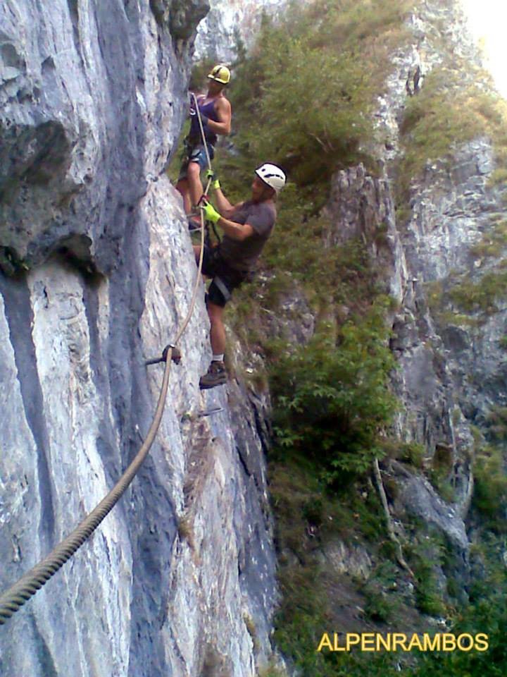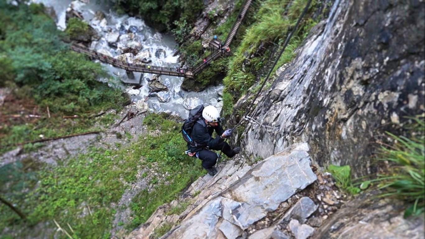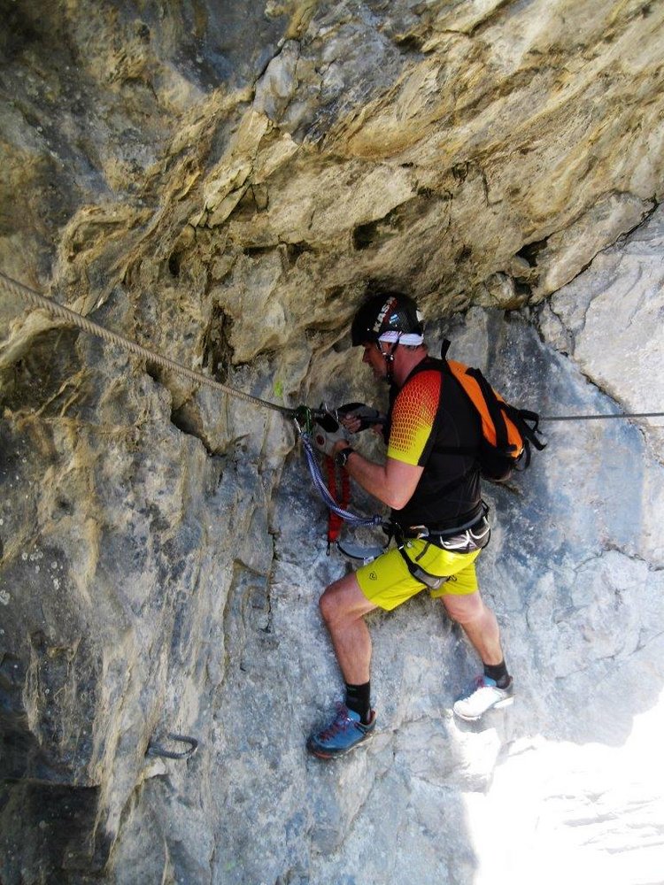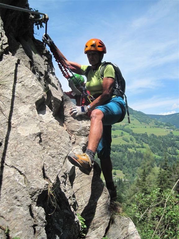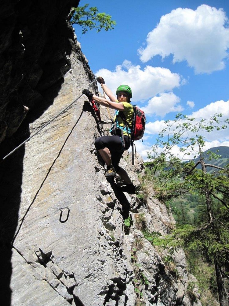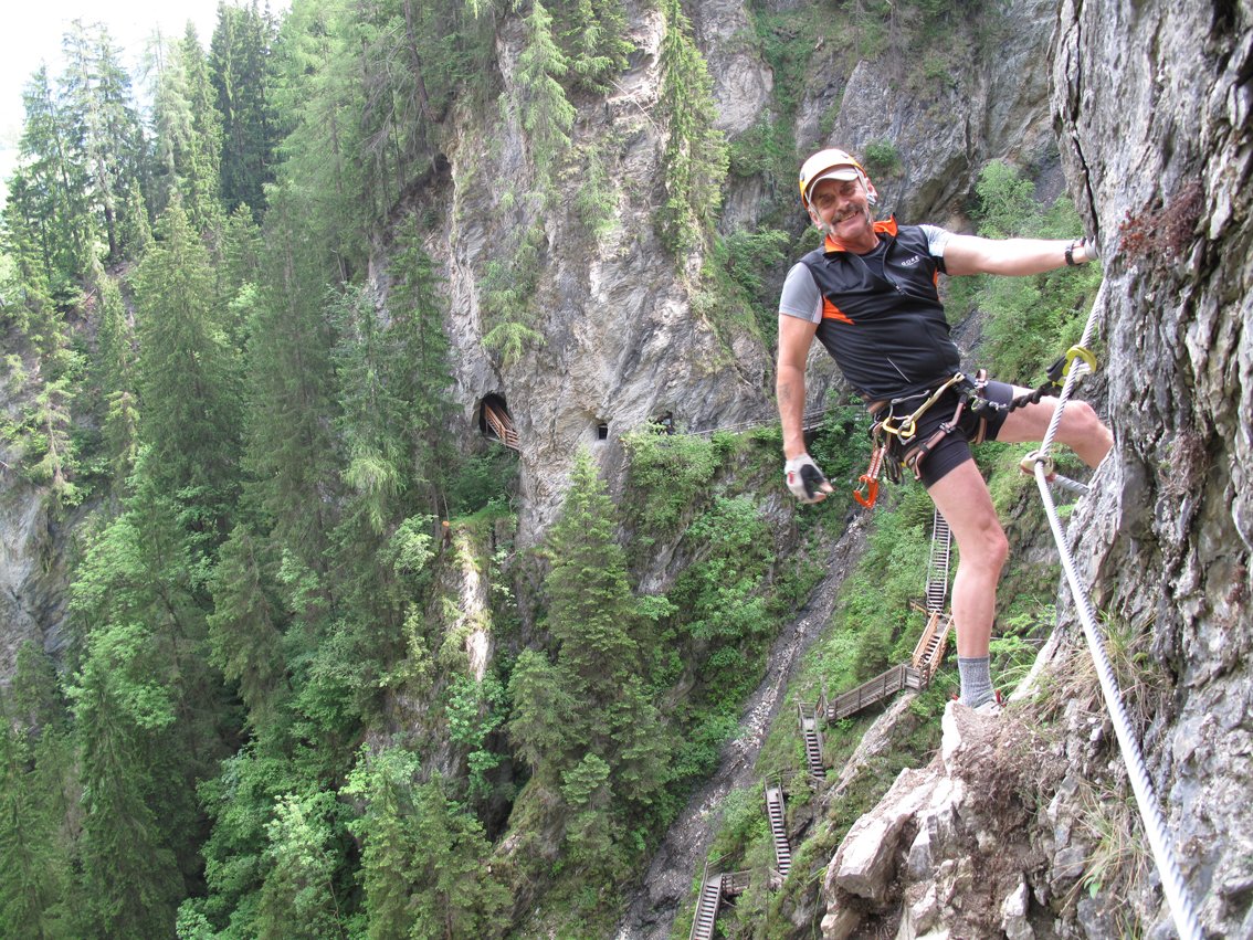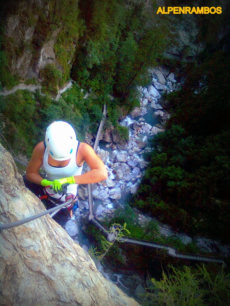 Die restlichen Meter verlaufen im mittelschweren Bereich (C, kurz C/D), aber an einer vertikalen Wand hinunter zum Ausstieg bei der letzten Klammbrücke.