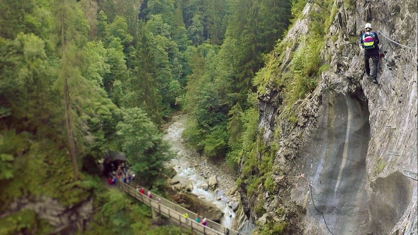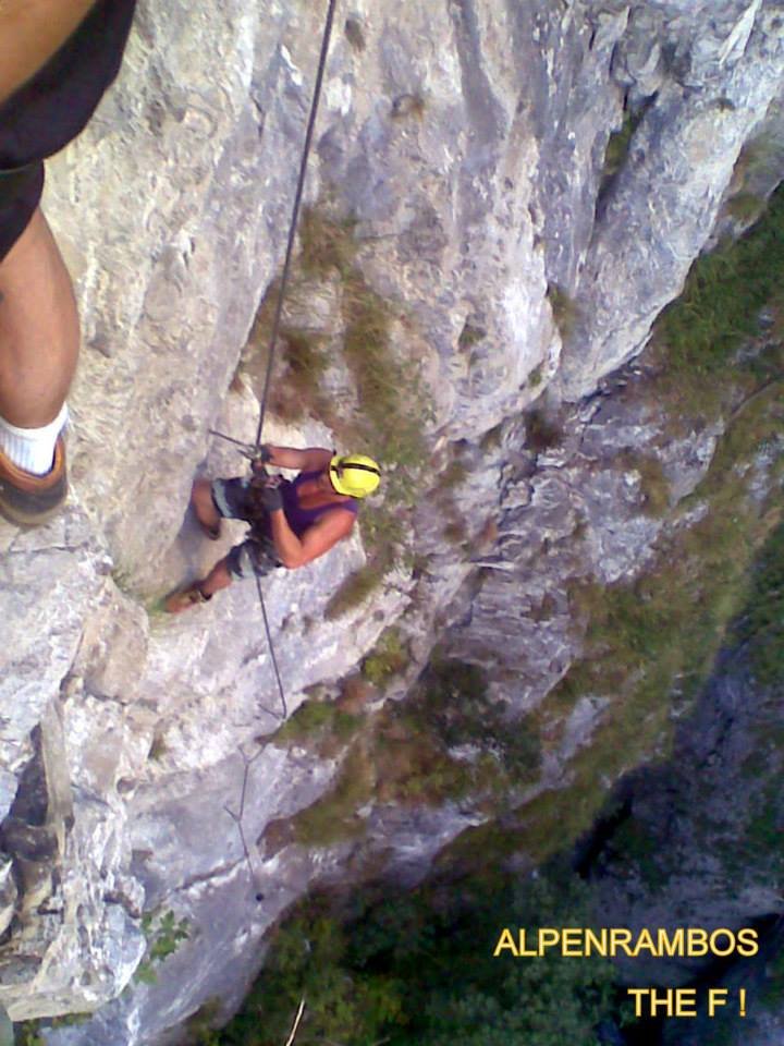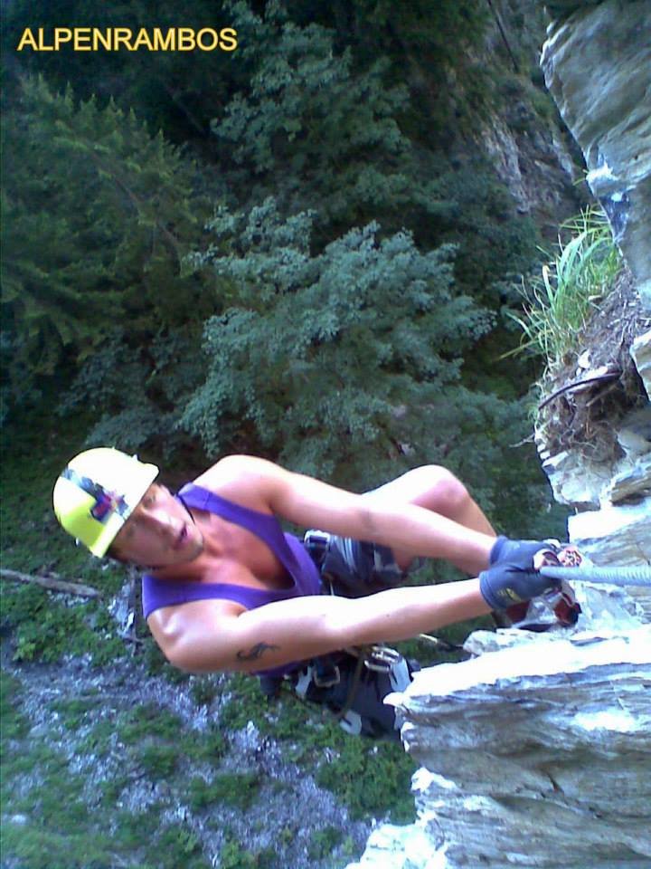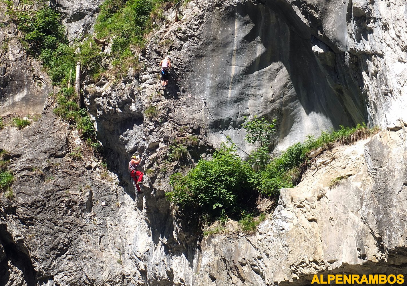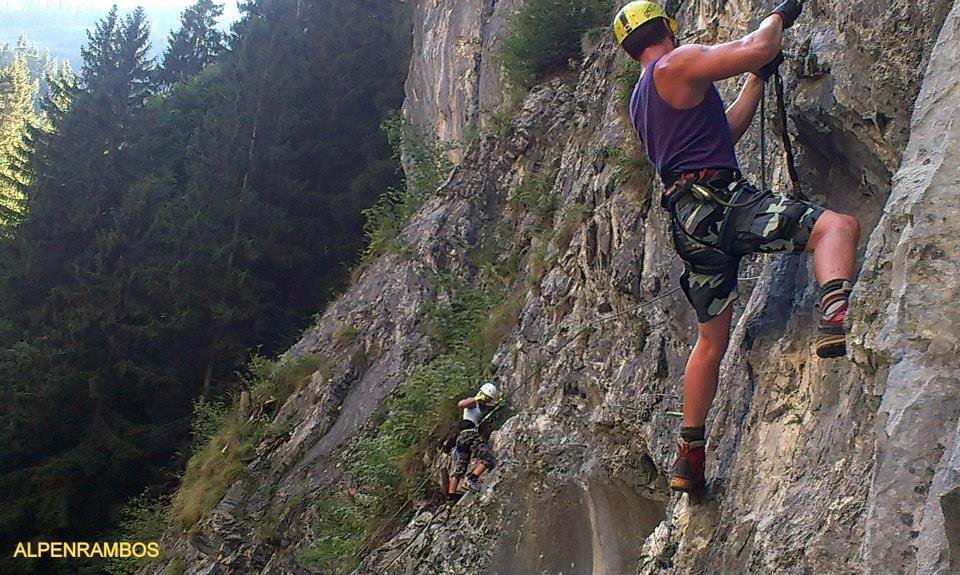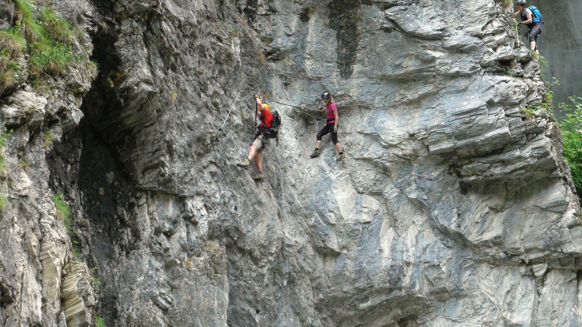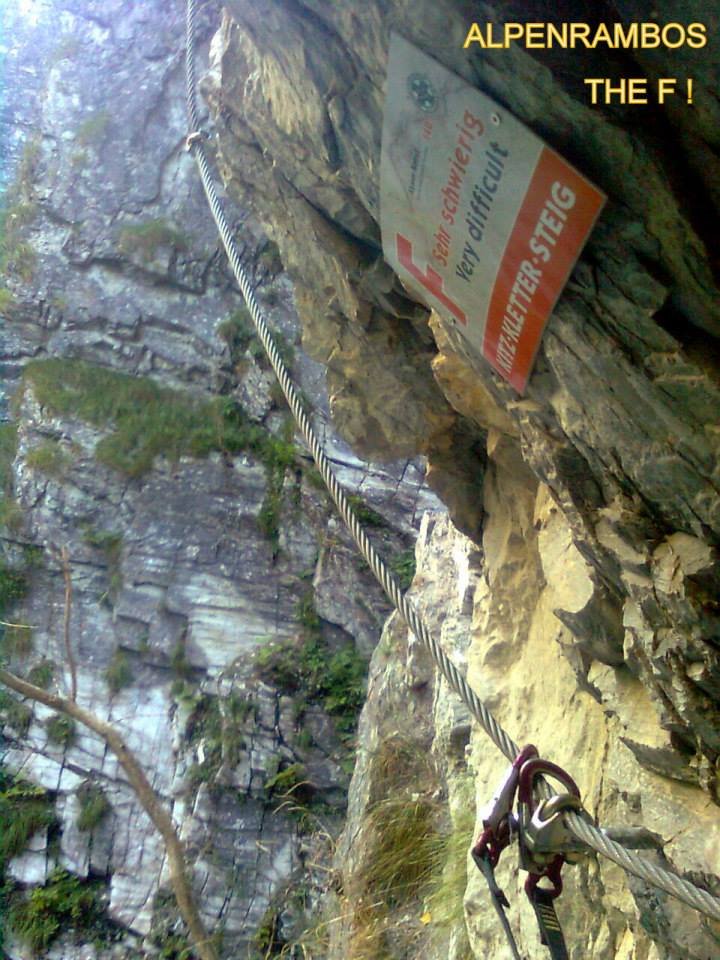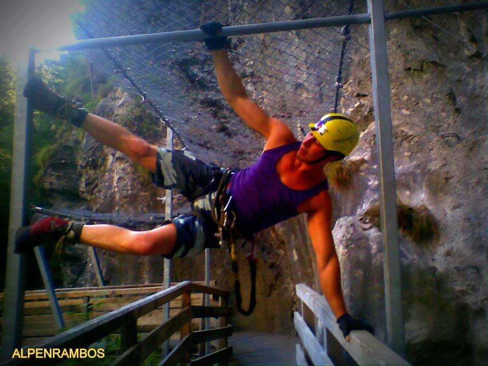 Die restlichen Meter verlaufen im mittelschweren Bereich (C, kurz C/D), aber an einer vertikalen Wand hinunter zum Ausstieg bei der letzten Klammbrücke.