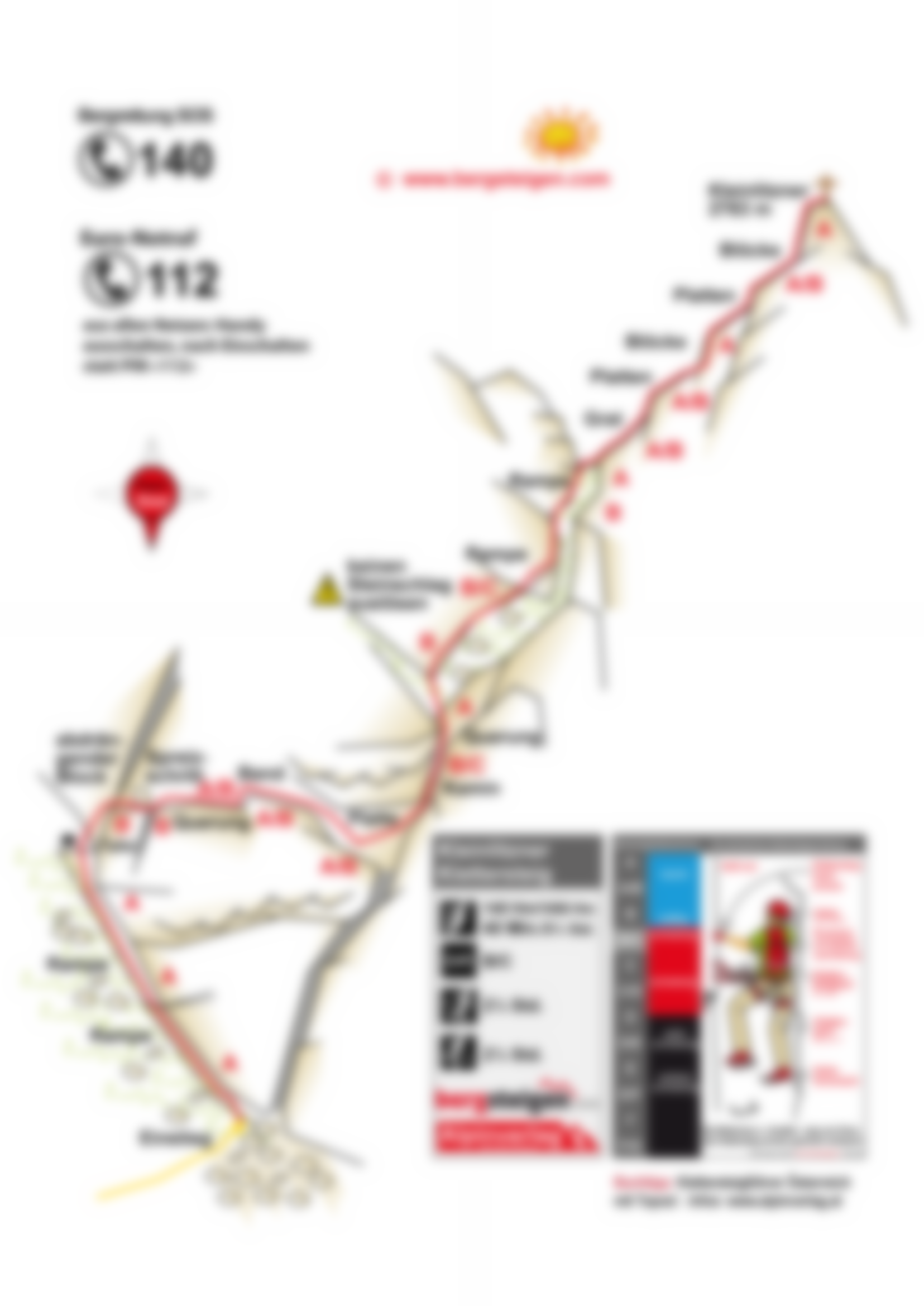 Vom Einstieg auf einer erdigen Rampe (A) zur Einstiegstafel. Über einen steilen Aufschwung (B) und um einen abdrängenden Block (B) zu einem Spreizschritt (B). Ausgesetzt nach rechts queren (A/B) und auf ein Band (A/B). Eine große Platte queren (A/B) und durch einen Kamin (B/C, Schlüsselstelle) in eine seichte, steinschlagträchtige Rinne (A). Gerade ansteigend aufwärts (A), dann am linken Rand auf einer Art Rampe (B u. B/C) weiter aufsteigen, am Ende wieder leichter (B u. A) zu einer Scharte. Am Grat südlich um ein paar Blöcke herum (A/B) zu einer Platte (A/B). Nun nördlich an einigen Blöcken vorbei (A) zu den Gipfelplatten (A/B) und unschwierig (A) zum ausgesetzten Gipfel.