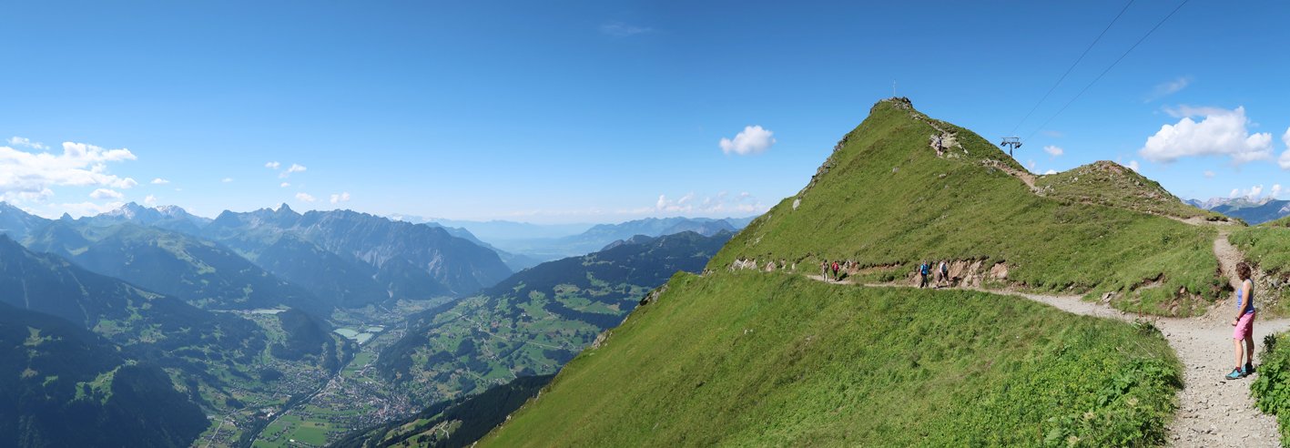Vom Ausstieg auf der Wiese weiter hinauf bis auf den "Gipfel". Auf der Rückseite dann flach zur Skipiste gehen. Auf der Piste weiter zur schon sichtbaren Wormser Hütte ansteigen. Von der Hütte auf dem aussichtsreichen Querweg (tolles Panorama ins Tal!) zurück zur Bergstation des Sennigrat Sesselliftes.