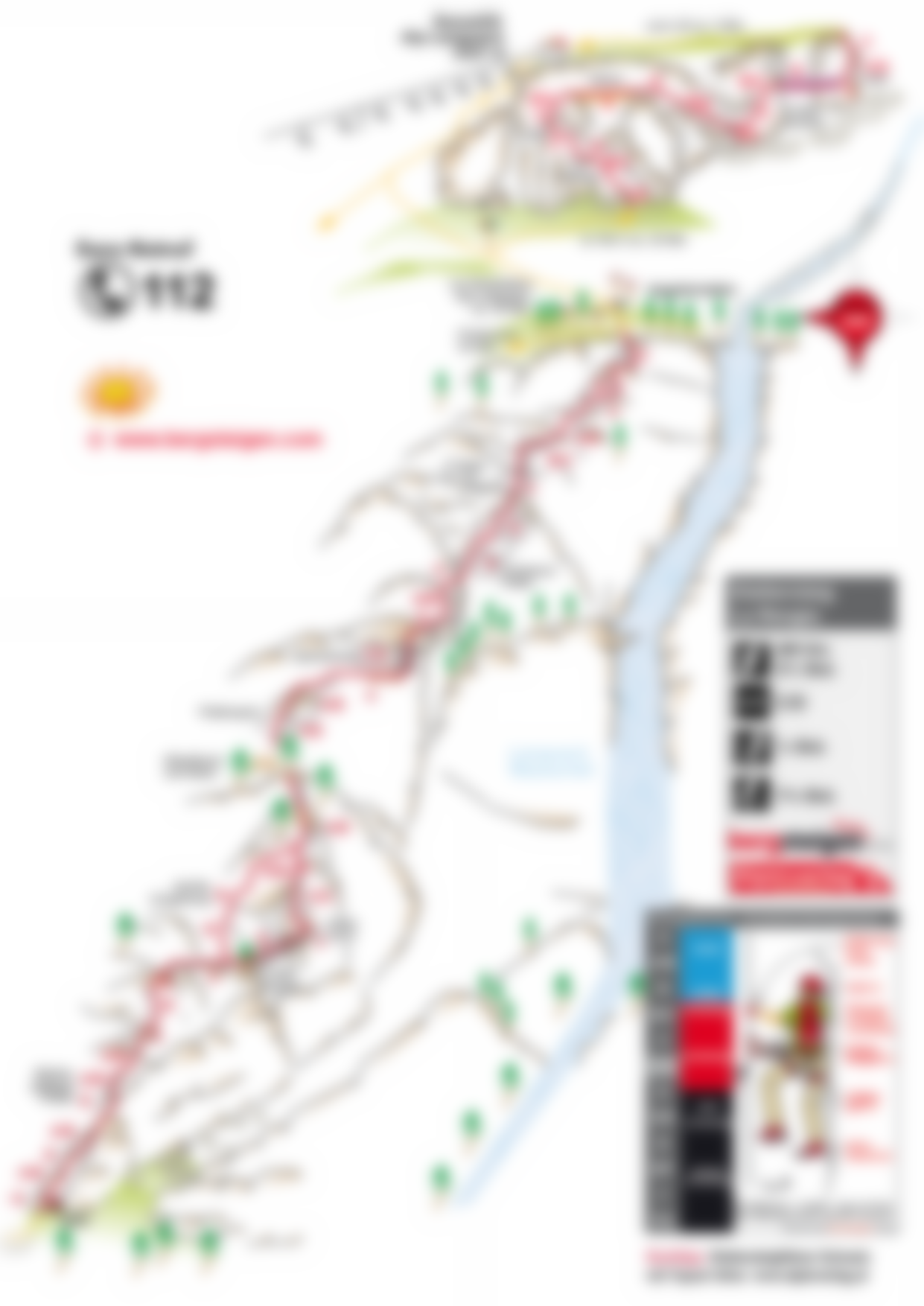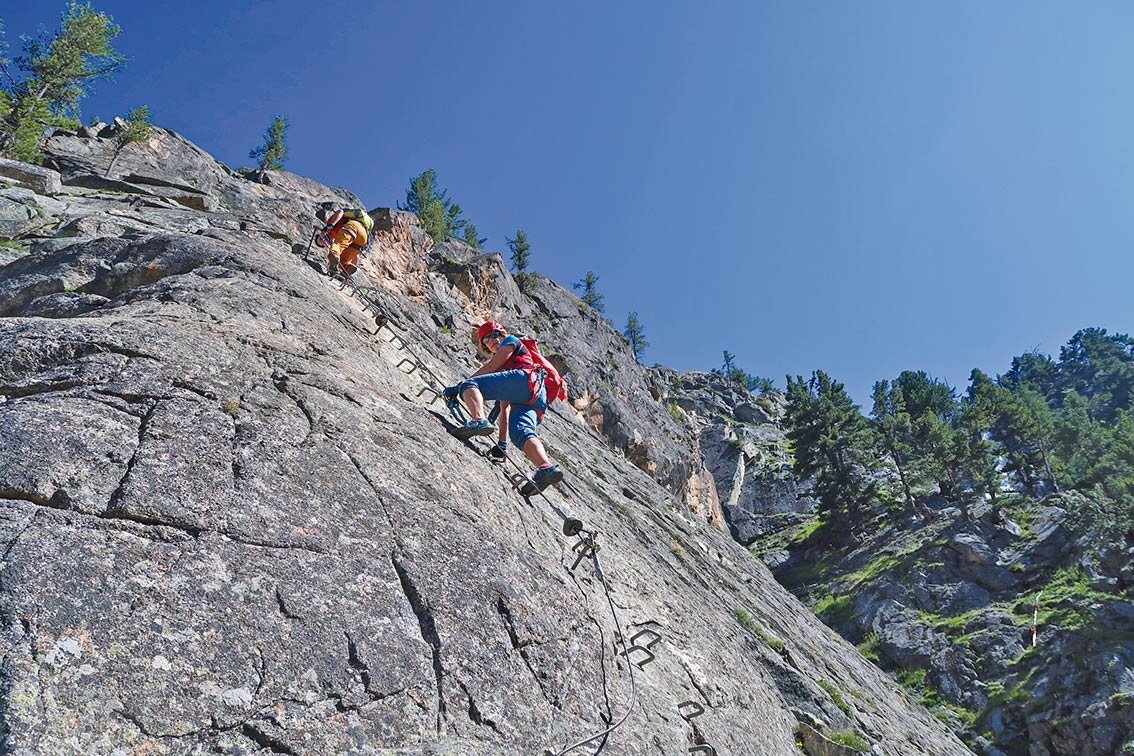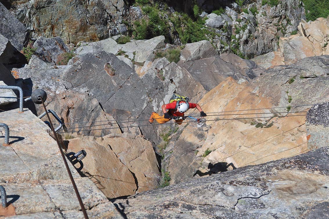 Siehe Topo: Am Einstieg bei einer Tafel auf einem flachen, plattigen Pfeiler aufwärts, meist A/B, kurze Stufe B hinauf zu einem Band. Auf diesem unschwierig (A) nach rechts zur 3-Seilbrücke (B) aufsteigen. Die führt zum Adlerhorst, einer steilen Wand (C/D und C; kann man links umgehen) und zur Rastbank. Weiter über schöne Platten (A/B) nach rechts unter eine Wand, der man nach rechts bis zum „Spinnennetz“ folgt. Nach dem großmaschigen Netz (C/D) gelangt man rechts ansteigend (A/B) zur „Schwarzen Platte“ (B). Es wechseln Platten und steile Wandaufschwünge ab (max. C), bis man den Ausstieg nahe des Röntgenwegs auf einer Höhe von 2198 m erreicht. Man folgt der Markierung weiter in Richtung Alp Languard, zweigt auf der Höhe einer Hütte rechts ab und gelangt zum Teil 2. Eine Querung führt zu einer steilen Kante (C), danach über einen Balken und eine abfallende Querung (A und A/B) zur Schlusswand. Nach einer kurzen steilen Passage (C) erreicht man eine 3-Seil-Brücke (B) und klettert danach das Finale (C/D) bis zum Ausstieg auf einer Bergwiese.