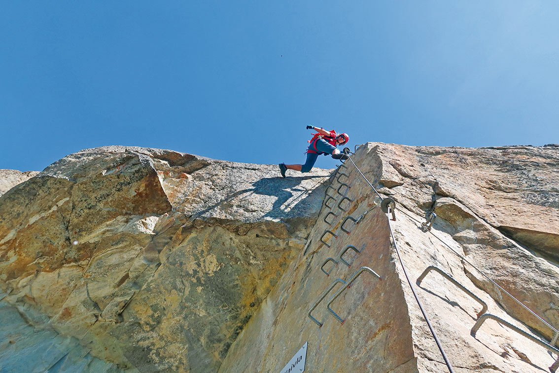 Erst nach zwei Projektanläufen und fast fünf Jahre nach dem ersten Bewilligungsansuchen konnte der Klettersteig neben dem Languard-Wasserfall am 4. Juli 2009 eröffnet werden (der obere Teil wurde später dazu gebaut). Zu heikel war die Umweltsituation mit dem Jagdbanngebiet, wo in der steilen Wand 34 verschiedene Vogelarten nisten. Letztlich wurde ein Kompromiss fixiert: Vom 1. Juli bis 31. Oktober dürfen die Ferratisten in der Südwestwand schwitzen und in der kühleren Jahreszeit gehört die gesamte Wand dem Federvieh zum Nisten. Der gut 550 m lange Eisenweg hat Sportklettersteigcharakter und ist durch die Action-Elemente und die geschickte Einbettung in die Wand über Platten, Kanten und Überhänge auch sehr abwechslungsreich. Laut dem Prospekt von Pontresina Tourismus eine Ferrata für Berggenießer, Eventgruppen, Familien, Bergsportanbieter, Bergführer mit Gästen - am wohlsten wird sich aber wahrscheinlich doch der ambitionierte Klettersteiggeher fühlen.