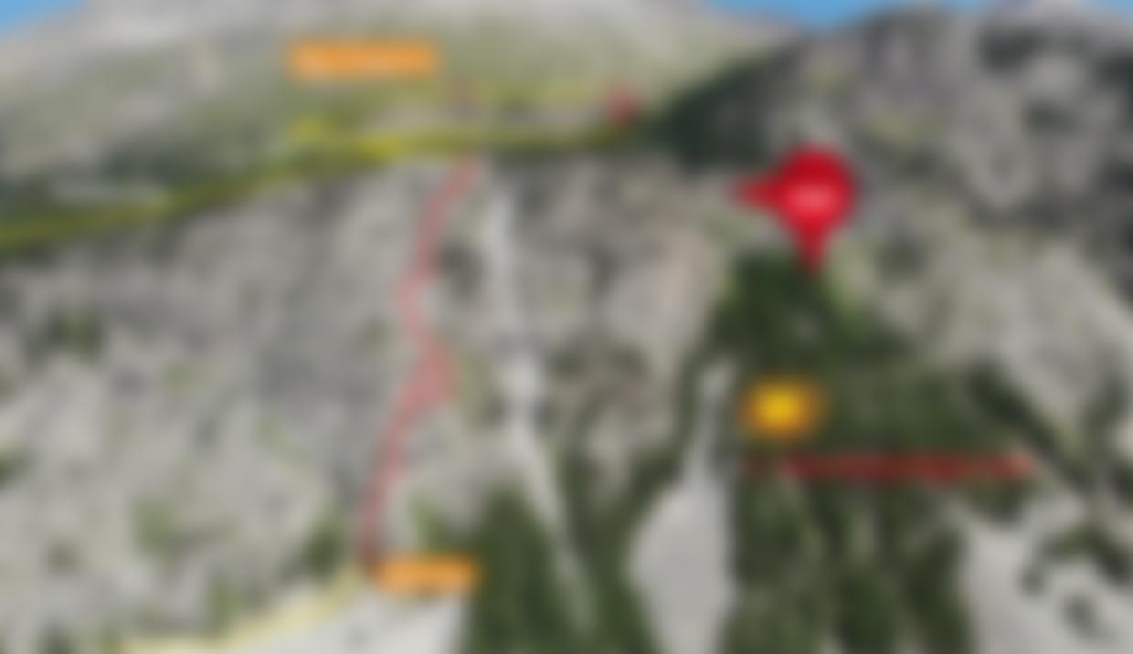 Auf der anderen Straßenseite auf dem Schotterweg kurz talauswärts. Auf der Rückseite der Häuser kommt man zu einem Schutzwall (Klettersteigtafel). Dort führt ein Pfad im Linksbogen anfangs durch lichten Wald hinauf, später rechts, querend im Schutt zum neuen Einstieg.