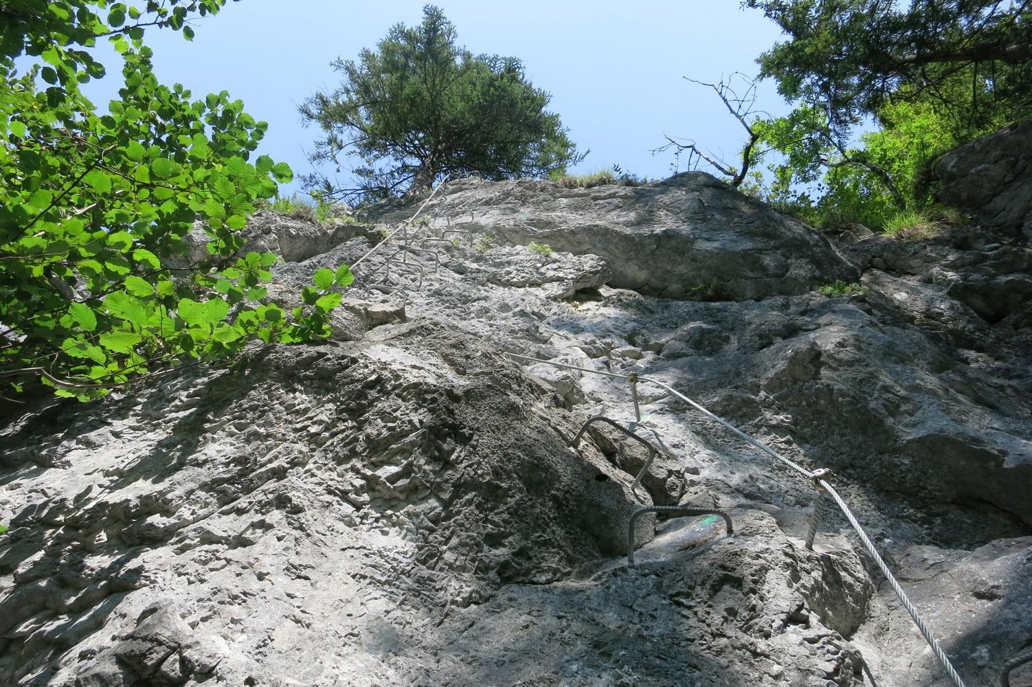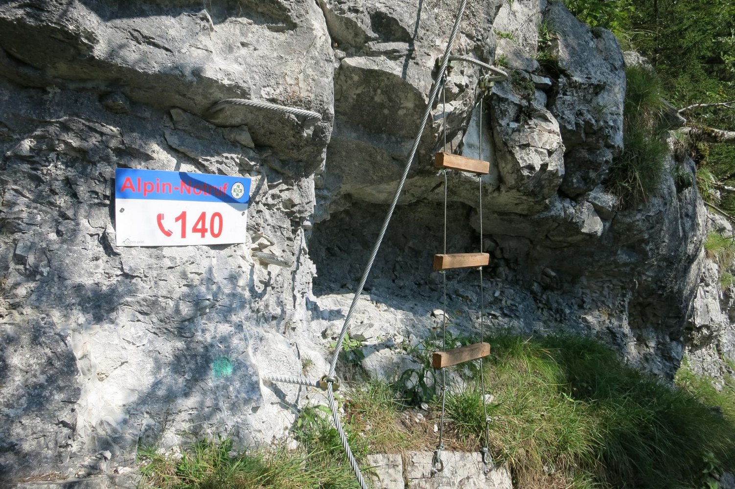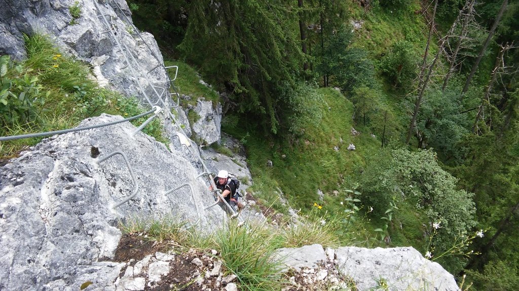 Stahlseil, teils überhängende Leitern, Stifte und Holzstrickleitern.