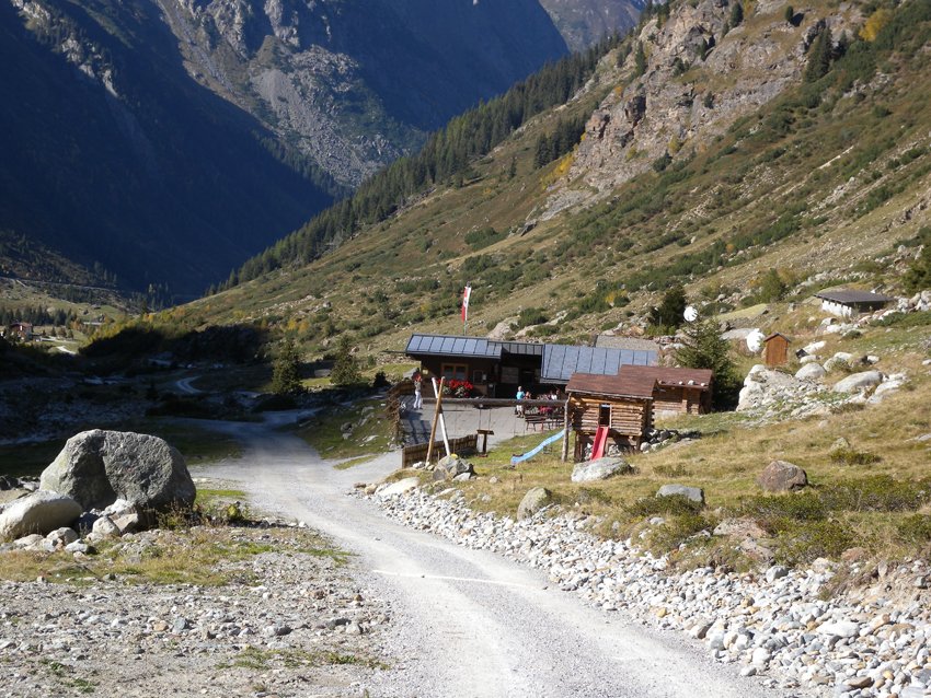 Vom Schranken auf der Fahrstraße zur Gletscherstube (ca. 30 Min.). Von dort auf dem alten Hüttenweg (Braunschweigerhütte - Wasserfall) zum Einstieg des Murmeltier- bzw. Erlebnissteiges (Tafeln).