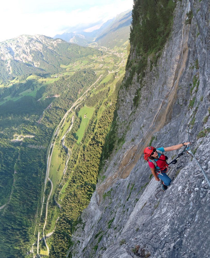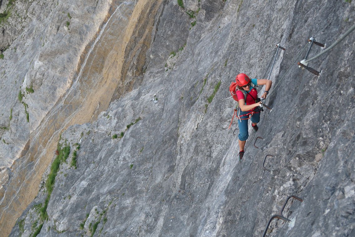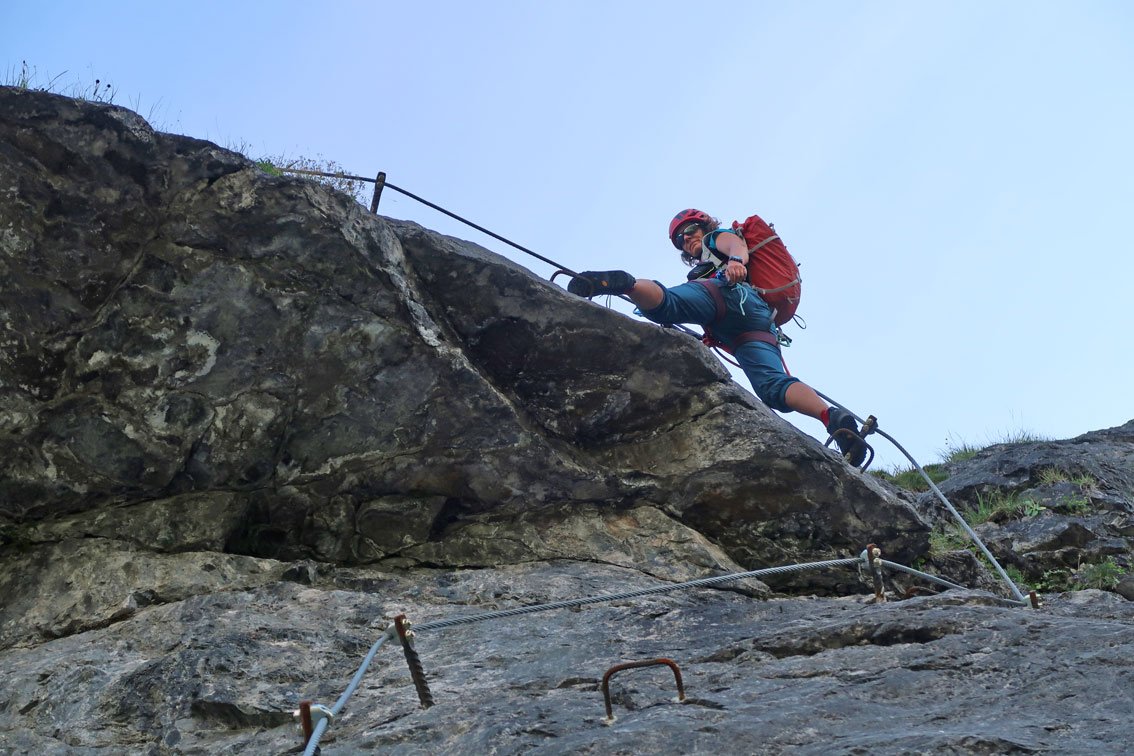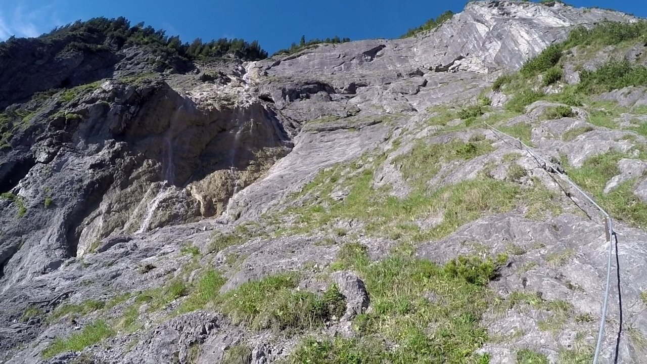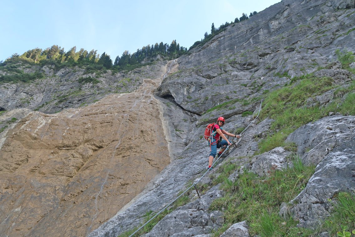 Die gewaltige Fallbachwand mit dem gleichnamigen Wasserfall war bis dato immer nur bei den Eiskletterern ein top Alpinziel. Im Frühjahr 2018 wurde rechts neben dem Wasserfall ein langer, mittelschwerer Klettersteig an die Wand gebaut. Ist bei den Eiskletterern die senkrechte, komplett freistehende Eissäule die Herausforderung schlecht hin, hat der Klettersteig keine technische Höchstschwierigkeiten – aber die Summe der vielen C/D und C Passagen sind die Challenge! Auch gut trainierte Klettersteiggeher heben spätestens ab dem Mittelteil des öfteren den Kopf, betrachten die nicht enden wollende Felswand und suchen nach dem Ende des Klettersteiges. Fazit: Nichts für Einsteiger – für Ferratisten mit etwas Ausdauer in den Unterarmen aber ein absolutes Muss!