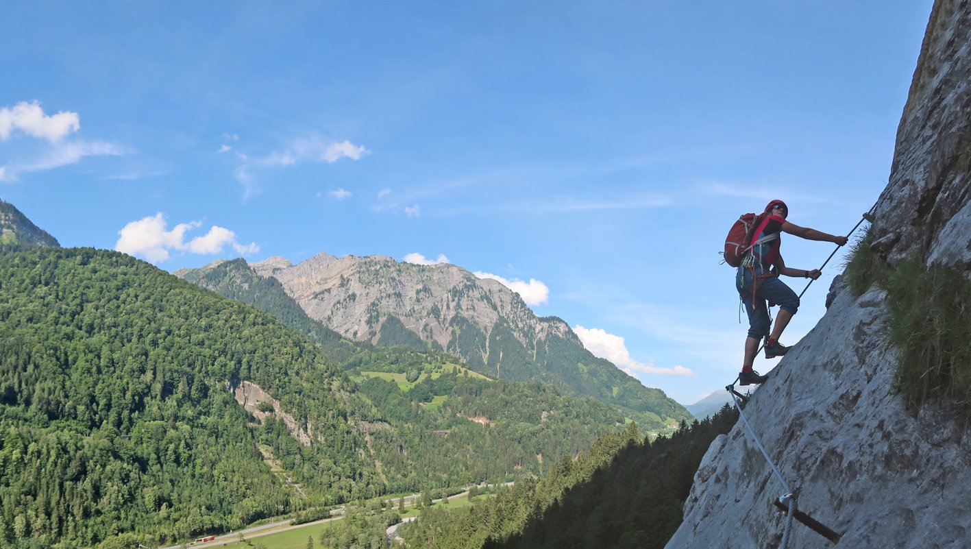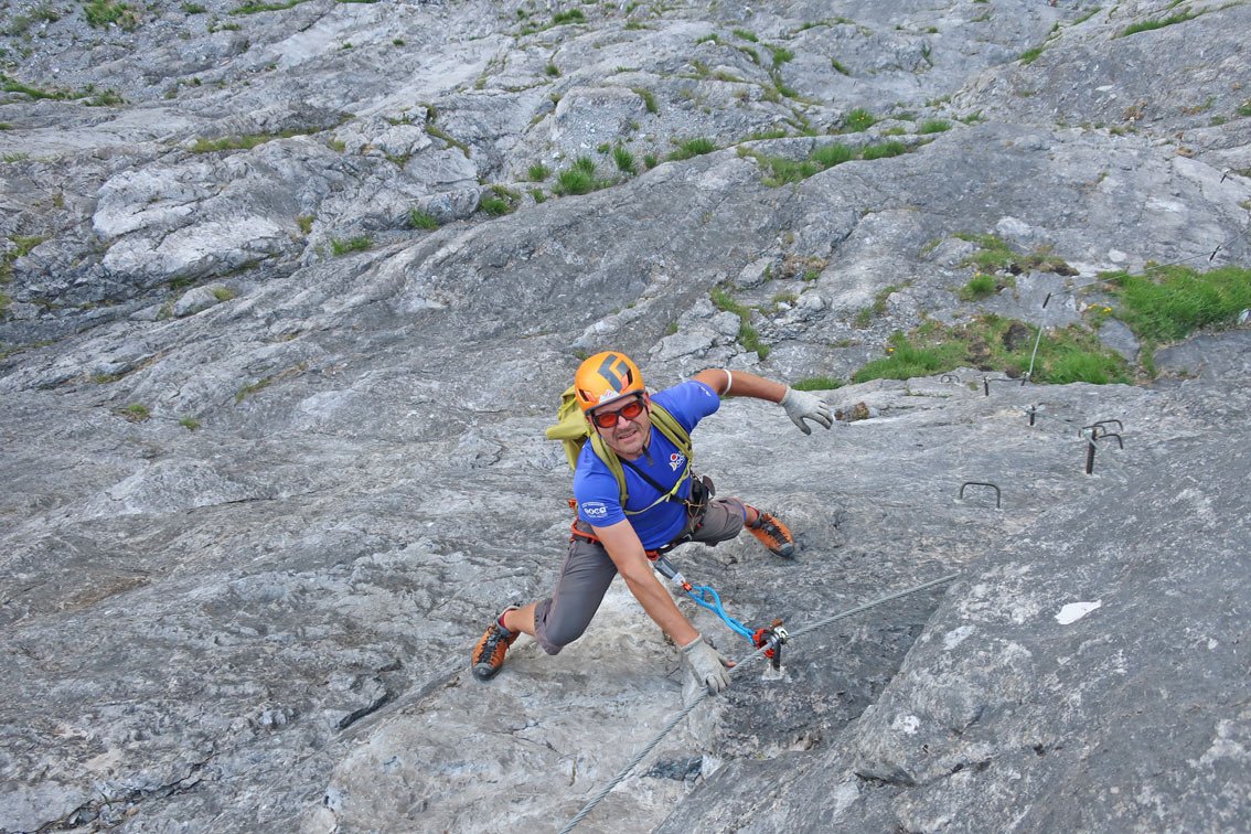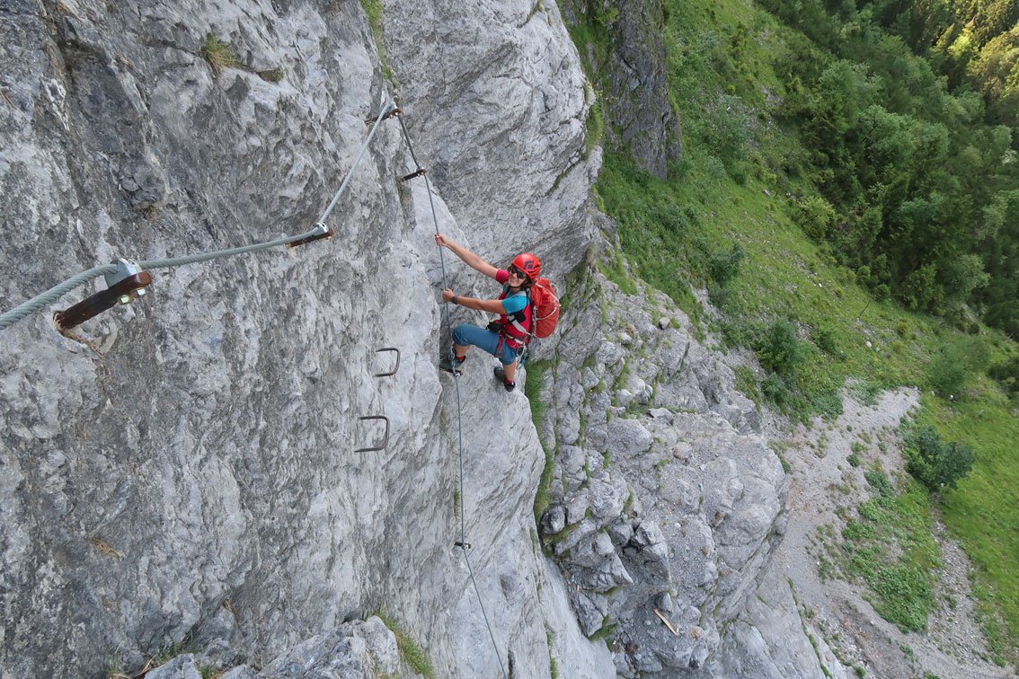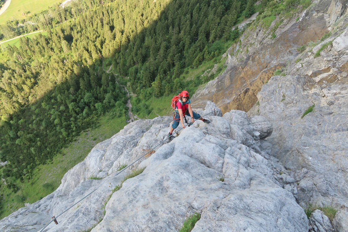 Die gewaltige Fallbachwand mit dem gleichnamigen Wasserfall war bis dato immer nur bei den Eiskletterern ein top Alpinziel. Im Frühjahr 2018 wurde rechts neben dem Wasserfall ein langer, mittelschwerer Klettersteig an die Wand gebaut. Ist bei den Eiskletterern die senkrechte, komplett freistehende Eissäule die Herausforderung schlecht hin, hat der Klettersteig keine technische Höchstschwierigkeiten – aber die Summe der vielen C/D und C Passagen sind die Challenge! Auch gut trainierte Klettersteiggeher heben spätestens ab dem Mittelteil des öfteren den Kopf, betrachten die nicht enden wollende Felswand und suchen nach dem Ende des Klettersteiges. Fazit: Nichts für Einsteiger – für Ferratisten mit etwas Ausdauer in den Unterarmen aber ein absolutes Muss!