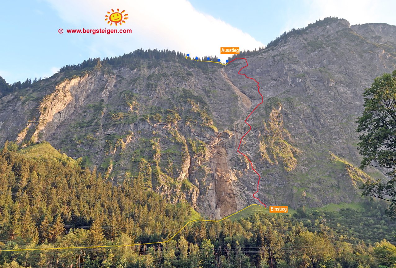 Am Einstieg kurz steil, dann plattig aufwärts zu einer steilen Wand mit Klammern. Über diese Wand höher (C/D) bis man steil gestuftes Gelände erreicht. In diesem wieder in Richtung Wasserfall (oft C) bis man auf einen flachen Platz mit Schotter kommt (Ende des steilen unteren Teiles). Von dort gestuft, aber immer auch mit steilen Abschnitten (bis B/C) lange leicht rechts ansteigend höher, bis man einen Platz mit einer Bank erreicht. Es folgt ein weiterer, langer leichterer Teil mit Graspassagen (Stellen bis B) bis man zu einer kleinen Schuttrinne, welche von rechts herunter zieht, gelangt. Es folgt eine plattige Passage, die immer steiler zu einem kleinen Überhang leitet (C bis C/D). Nach dem kleinen Überhang immer steil und fordernd höher (bis C) bis auf das Band vor der dunklen Schlusswand. Die steile Wand rechts ansteigend aufwärts - es gibt dort weniger Klammern als unten (Stellen C/D) – bis um eine Kante. Dort noch einmal steil (C/D, dann leichter) hinauf bis zum einem Latschenband. Auf dem Band nach links gehen und leicht absteigend um einen Felsriegel herum, am Ende steil und erdig zum Ende des Klettersteiges.