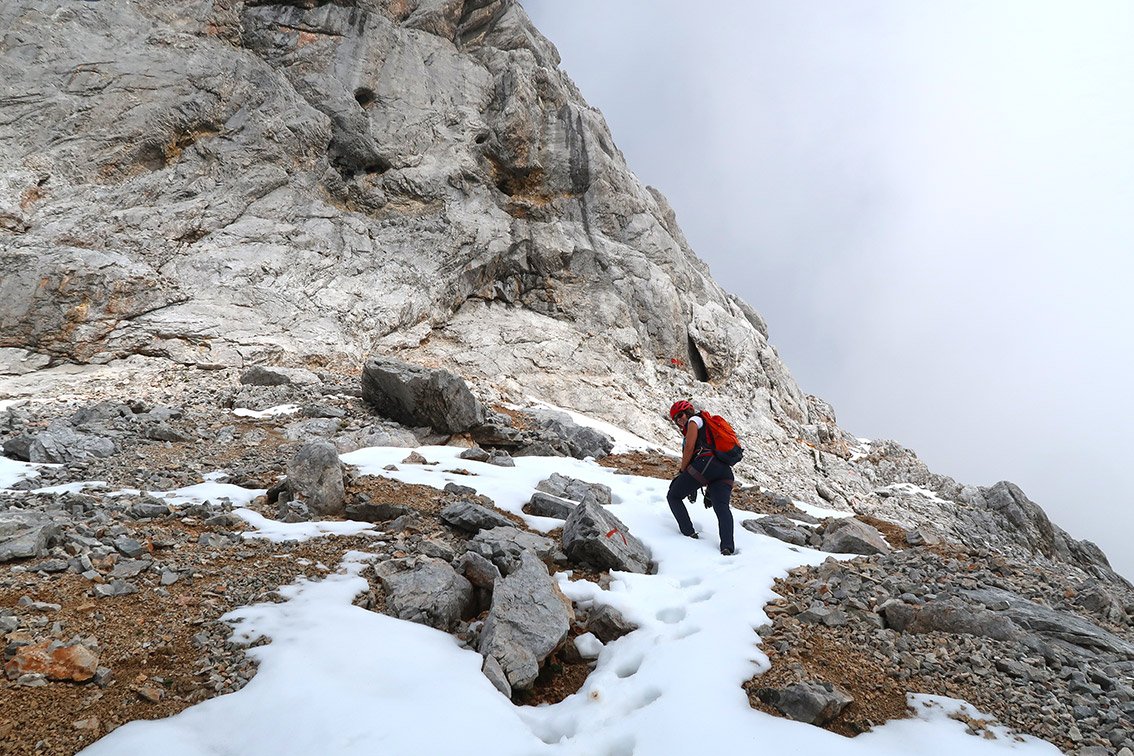 Vom Parkplatz auf einer Forststraße zur Hütte aufsteigen. Von der Erichhütte auf Weg 432 weiter in die Hochscharte. Auf 2220 m folgt ein Wegweiser. Dort nach links abzweigen und in Kürze zum Einstieg.