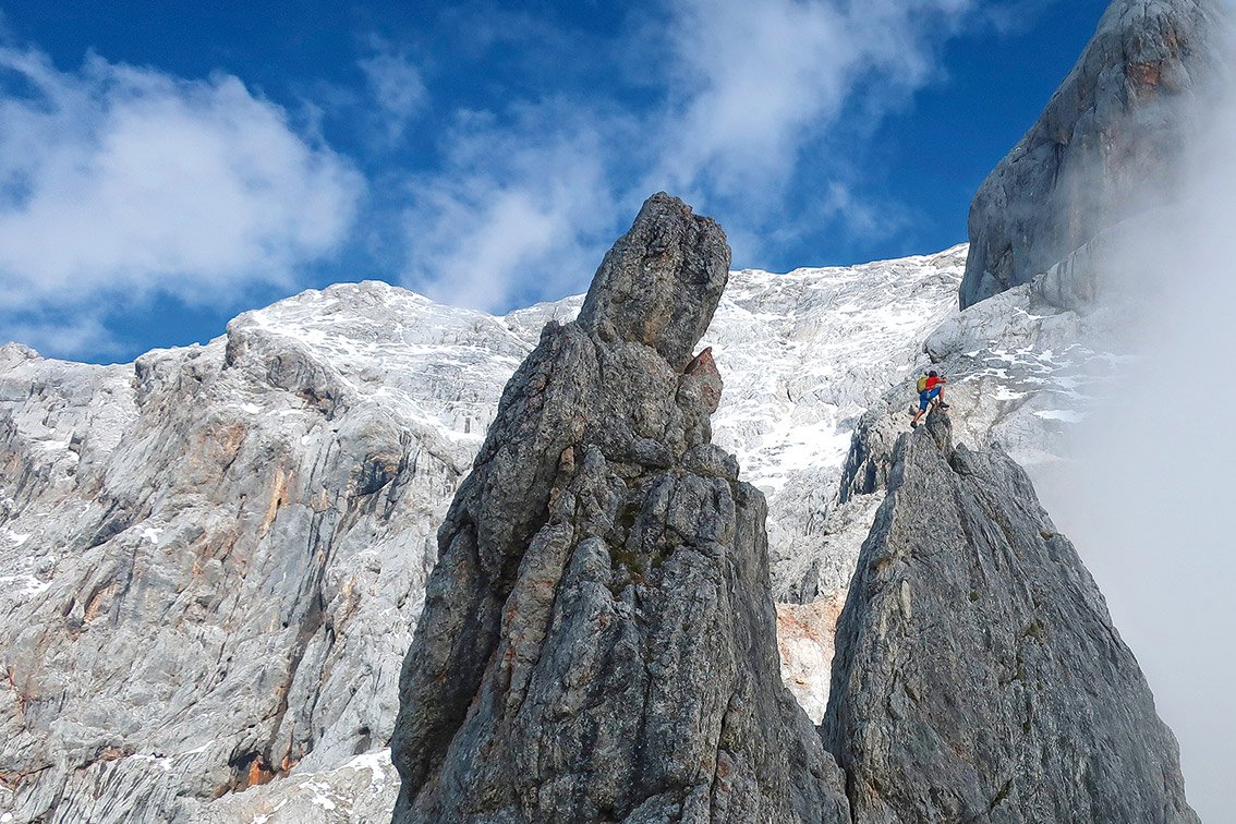 Vom Ausstieg rechts haltend in wenigen Minuten in die Birgkarscharte absteigen (von dort alternativ in 30 Min. zum Hochkönig-Gipfel).