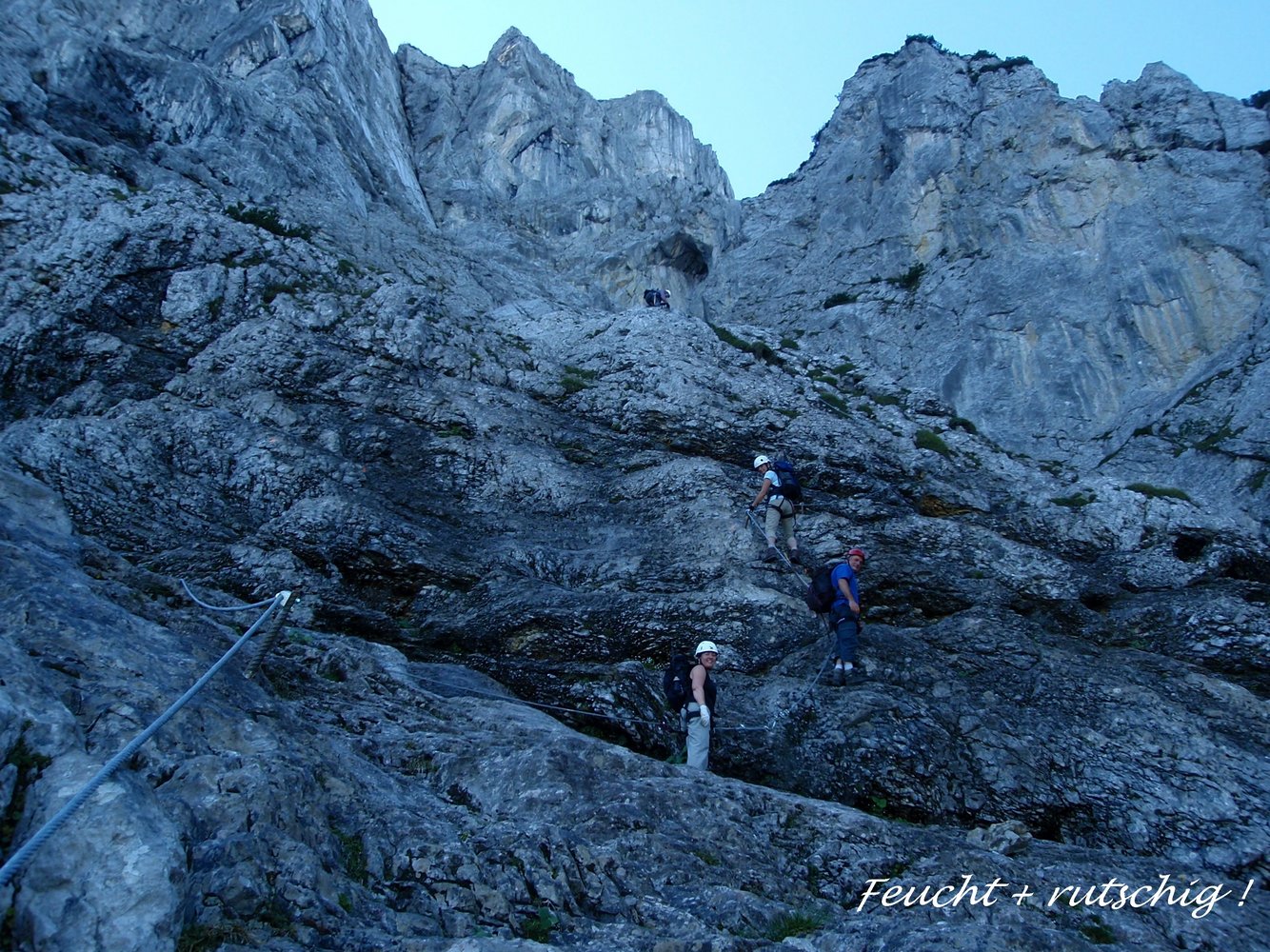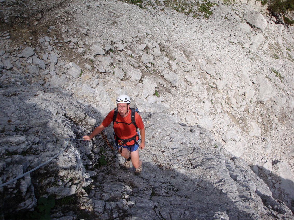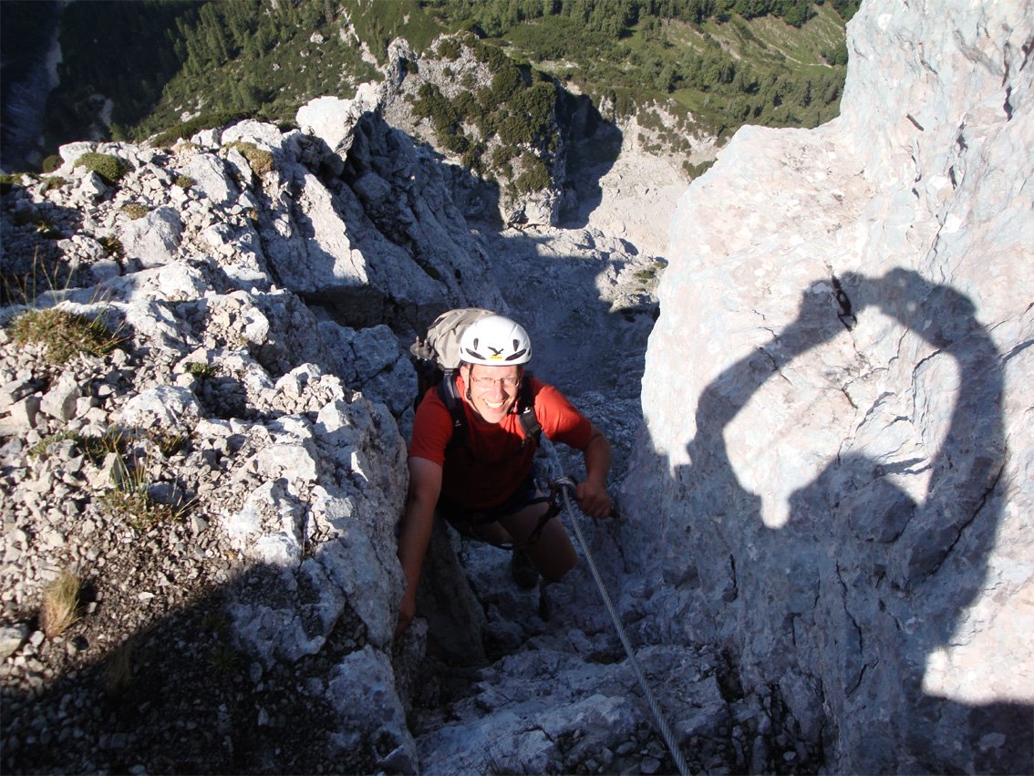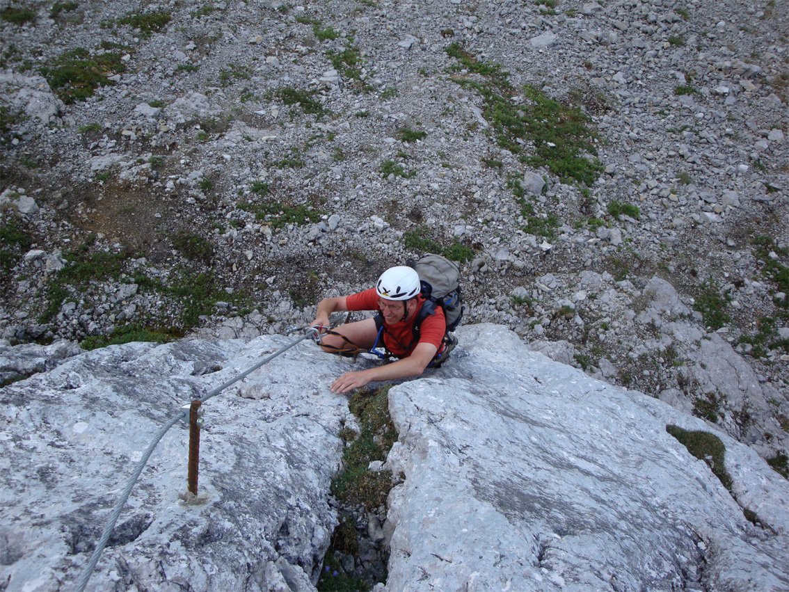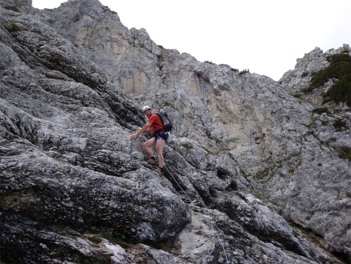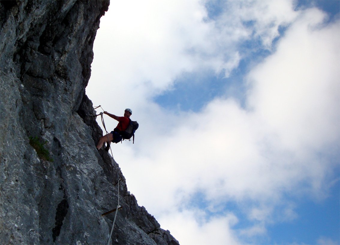 Komplette Klettersteigausrüstung und Helm, für schwächere Geher ein Sicherungsseil.