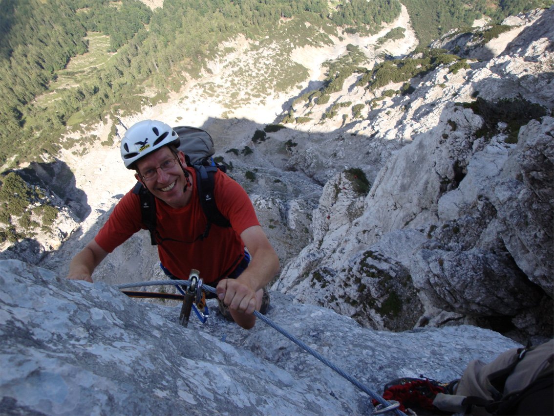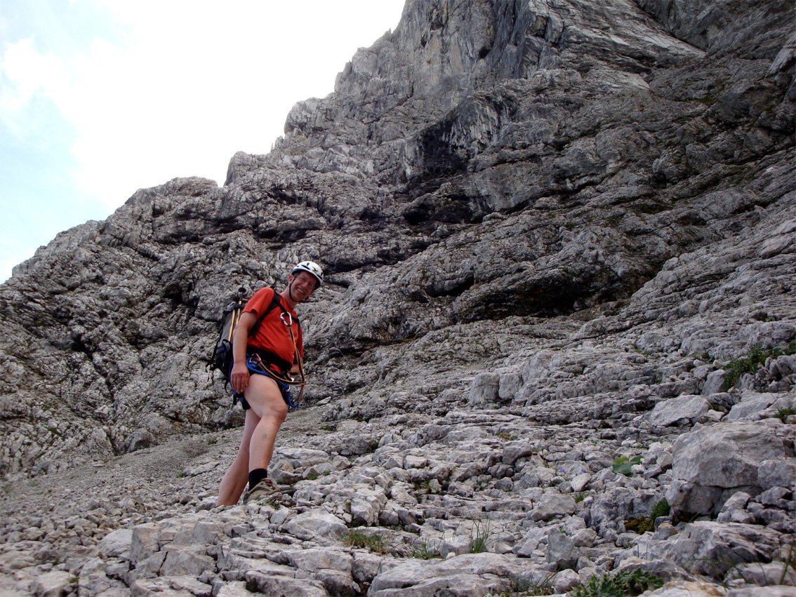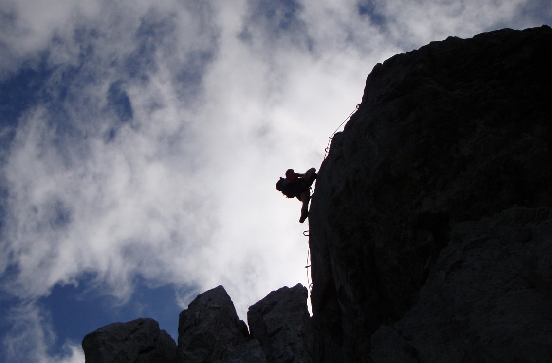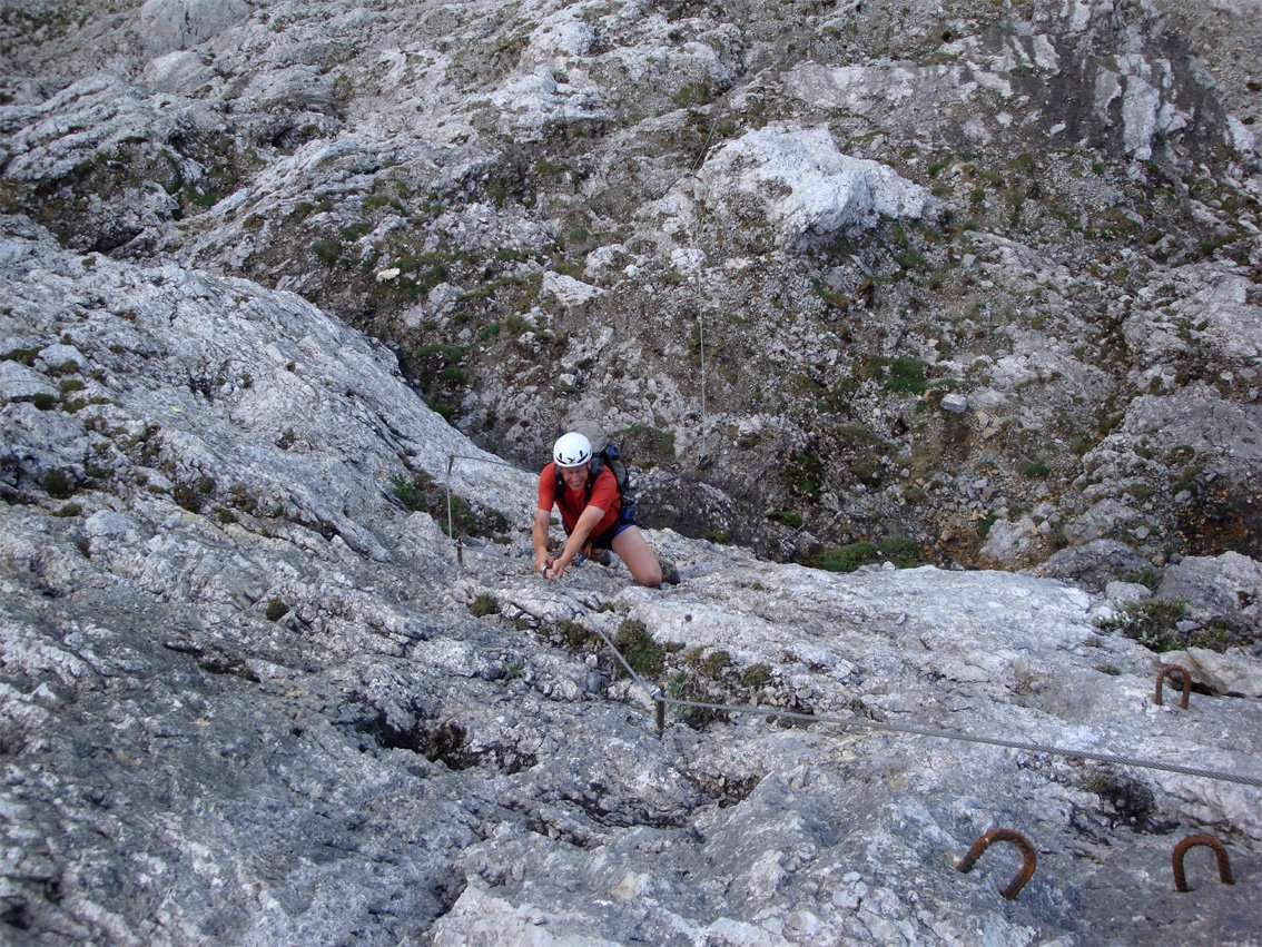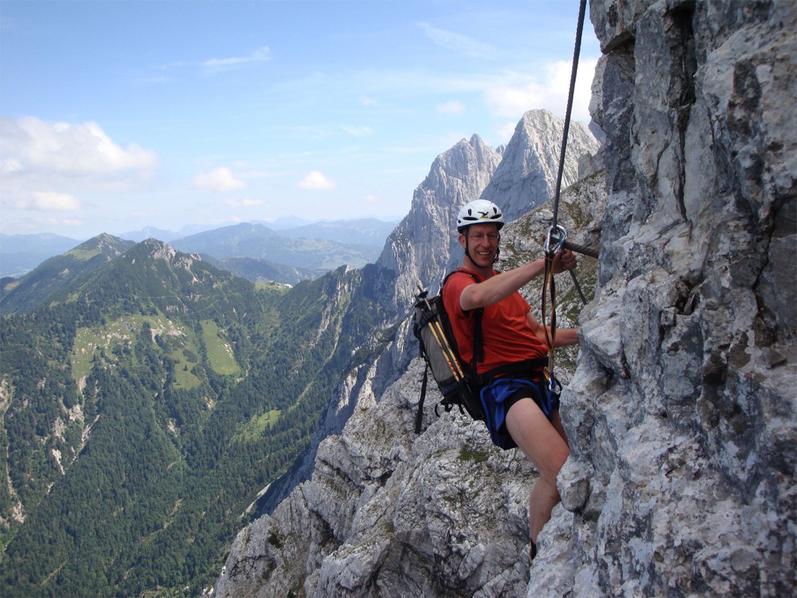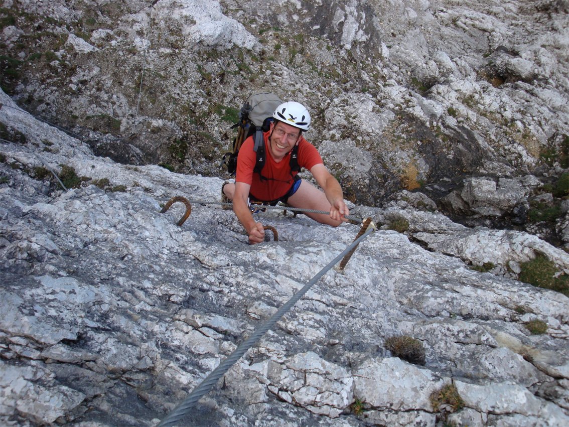Komplette Klettersteigausrüstung und Helm, für schwächere Geher ein Sicherungsseil.