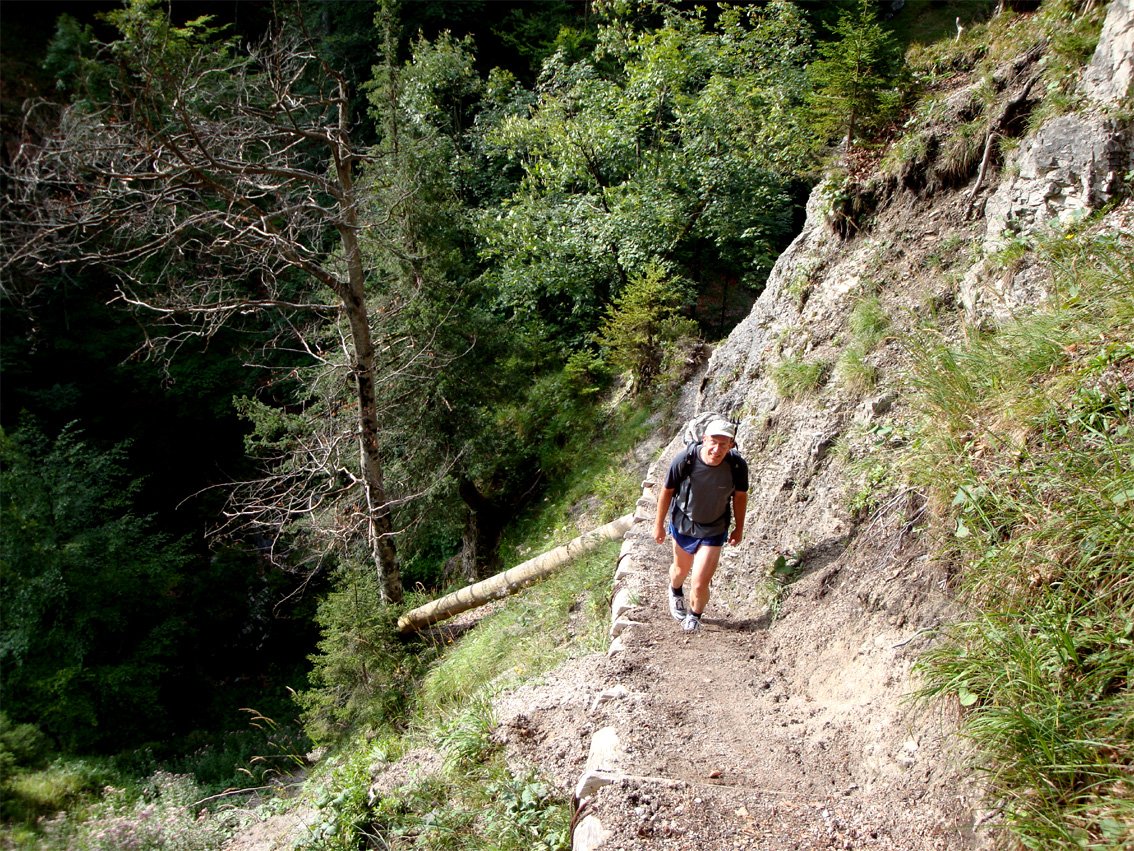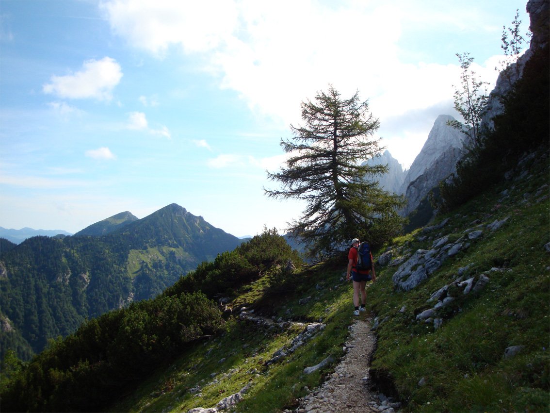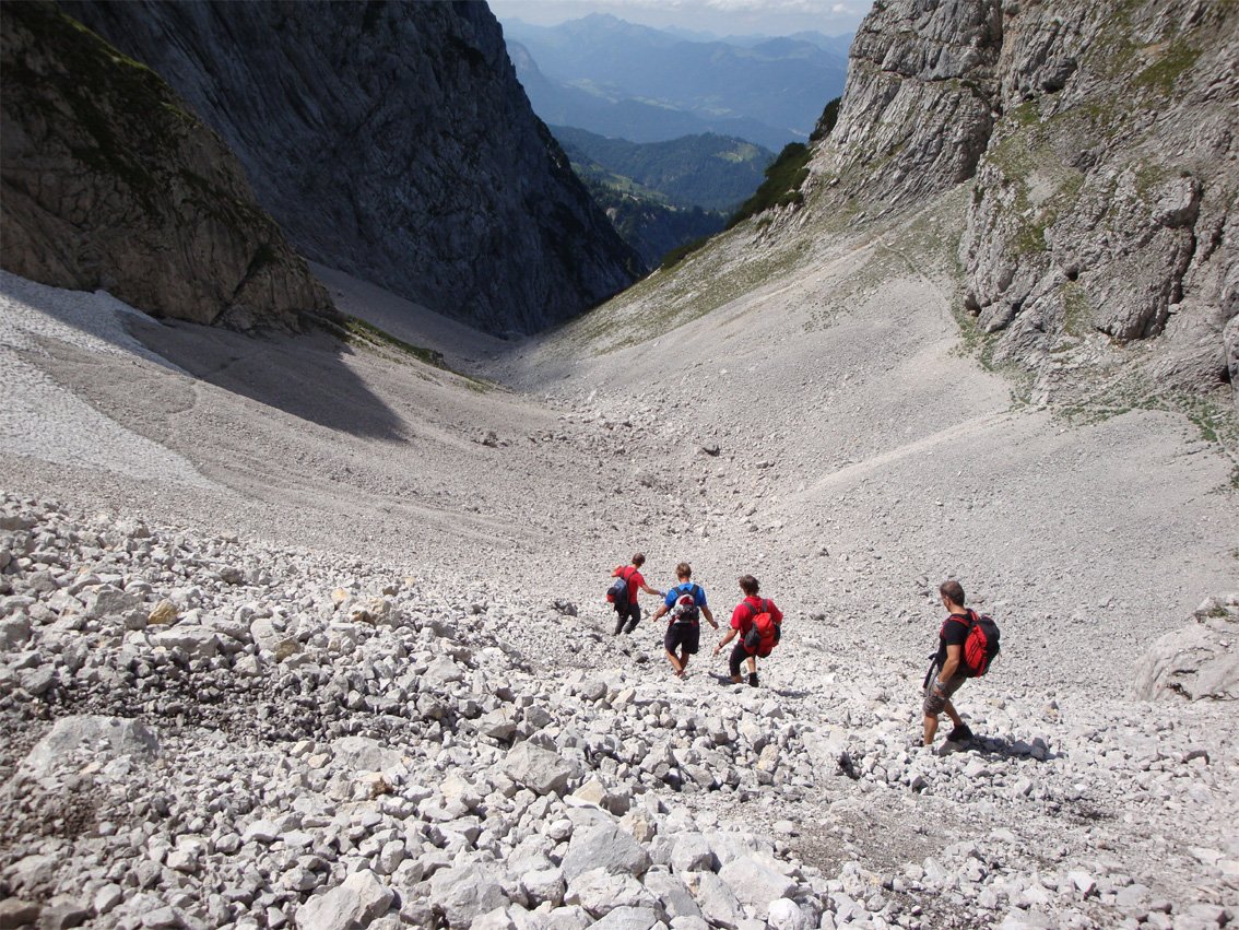 Vom Gipfel folgt man kurz dem Grat in südöstlicher Richtung und steigt dann rechts zum schon sichtbaren Güttlersteig ab (kurze Drahtseilpassage A/B). Über diesen dann hinunter nach Hinterbärenbad (Anton-Karg-Haus).