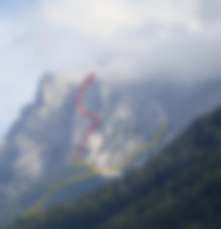 Vom Einstieg über gestuftes Gelände (A) zu einer steileren Passage rechts einer Rinne (B), von der man über Schrofen (A/B und A) auf das erste Schuttband gelangt. Links geht man zum Beginn des zweiten Vorbaues, dieser ist unten steiler (B), wird aber vor der sog. schwarzen Wand wieder etwas flacher (A/B). Sehr steil (C/D und D) steigt man rechts der schwarzen Wand empor und gelangt leicht rechts haltend, immer noch sehr luftig (C und C/D) in gestuftes Gelände. Dort links hinauf (B u. A) zu Schuttband. Gehend erreicht man den nächsten Abschnitt, dieser führt teilweise steil (C) hinauf auf den Grat (Absatz). Über einen Block (B) erreicht man einen steilen Kamin (C) an dessen Ende ein sehr steiler, ausgesetzter Pfeiler (C/D) überwunden werden muss. Etwas leichter (C) erreicht man ein kleines Band (kurz gehen). Eine Wandstelle (B/C) führt nach links zu einer kurzen Steilstufe (C), nach dieser erreicht man ein Querband (B und A). Zu Beginn leicht (A) und kurz ab- und aufsteigend (B) kommt man in den sog. Götterquergang. Waagrecht (C), dann aber leicht aufsteigend (C), erreicht man das letzte, sehr ausgesetzte Steilstück (C/D) vor dem Gipfelgrat (A) und schlussendlich den Gipfel.