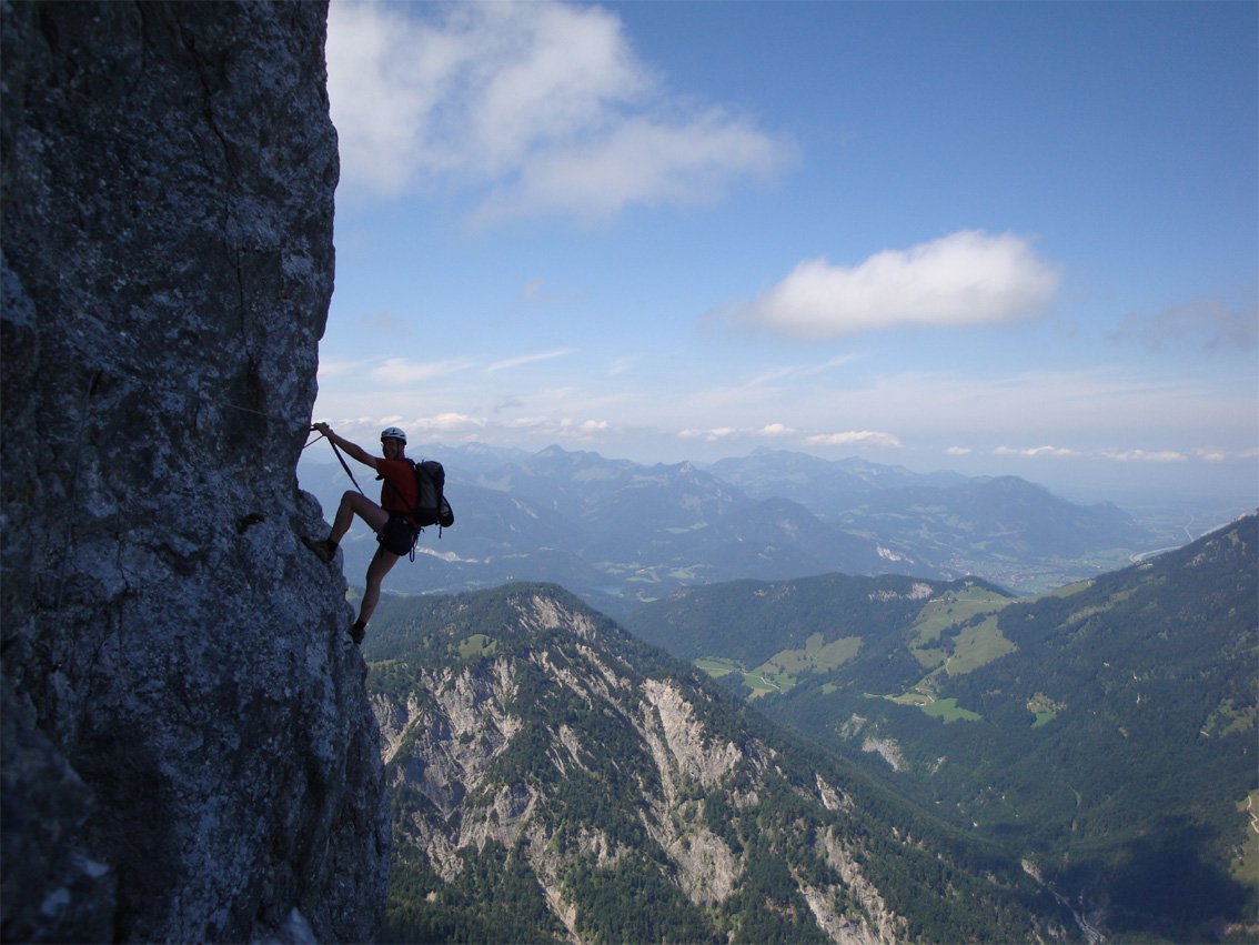 Sehr gut angelegter Klettersteig durch die Nordabbrüche der Gamskarköpfe. Der Eisenweg wurde im alpinen Stil gebaut und kommt mit wenig Trittbügeln aus. Der Steig teilt sich in drei Teile, einem Schrofenteil folgt ein sehr steiler Mittelteil, oben steigt man zur Krönung über eine sehr ausgesetzte Querung direkt auf dem Gipfel aus. Vom Gipfel des Unteren Gamsköpfls, mit seinem sehr schönen, schlichten Gipfelkreuz, genießt man den fantastischen Weitblick ins Inntal und auf den Zahmen Kaiser. Wer nach dem Klettersteig noch ca. 1 Std. Aufstieg anhängt, kann vom Gipfel des Sonnecks auch auf die Südseite des Wilden Kaisers blicken und mit etwas Wetterglück sogar die vergletscherten Gipfel des Alpenhauptkammes sehen.