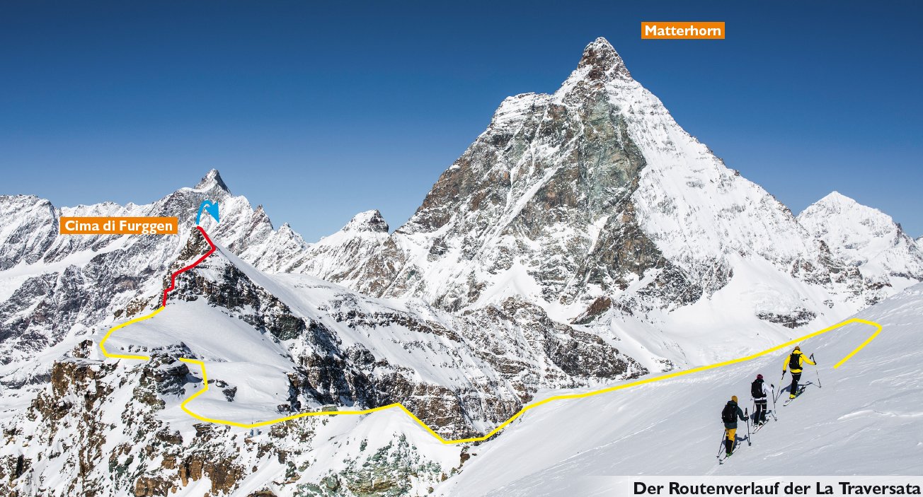 Nach dem Zweiten Weltkrieg wurde die damals höchste Seilbahn der Welt auf die Cima di Furggen gebaut. Im Jahr 1993 riss in einer Sturmnacht das Zugseil und die Seilbahn wurde stillgelegt. Seither wird der Wiederaufbau aus Umweltschutzgründen verhindert. Die Schweizer nehmen das aber nicht so genau, denn 2015 wurde ein Klettersteig hinauf zur Seilbahnstation-Ruine und 2018 Europas höchste Seilbahn auf das Kleine Matterhorn gebaut. Die La Traversata wird vor allem im Winter gemacht und bietet eine tolle Kombination aus Skitour, Freeriden und hochalpinem Klettersteig - eine Begehung kann natürlich auch im Sommer erfolgen.