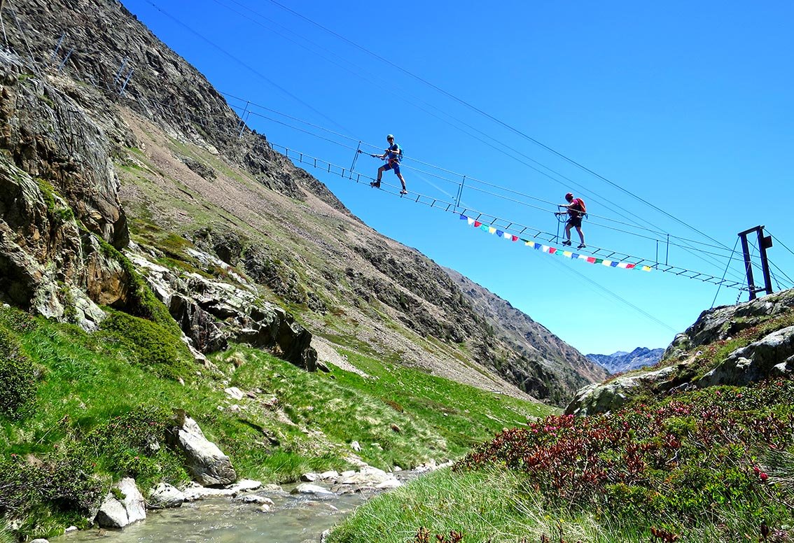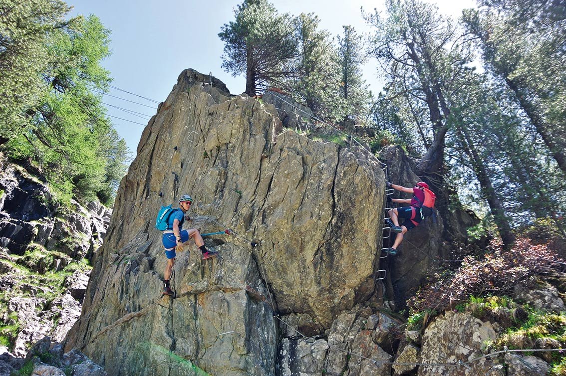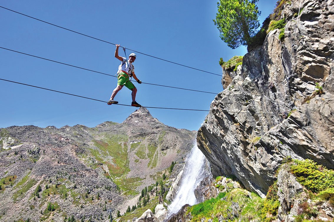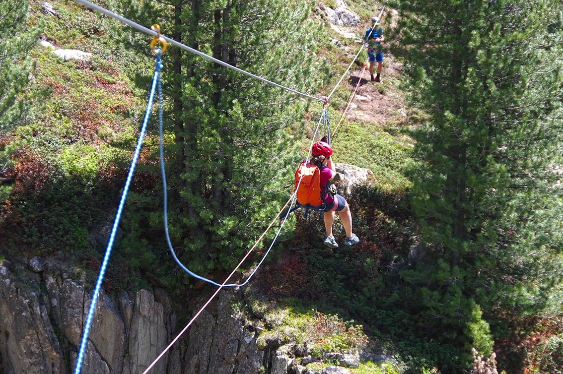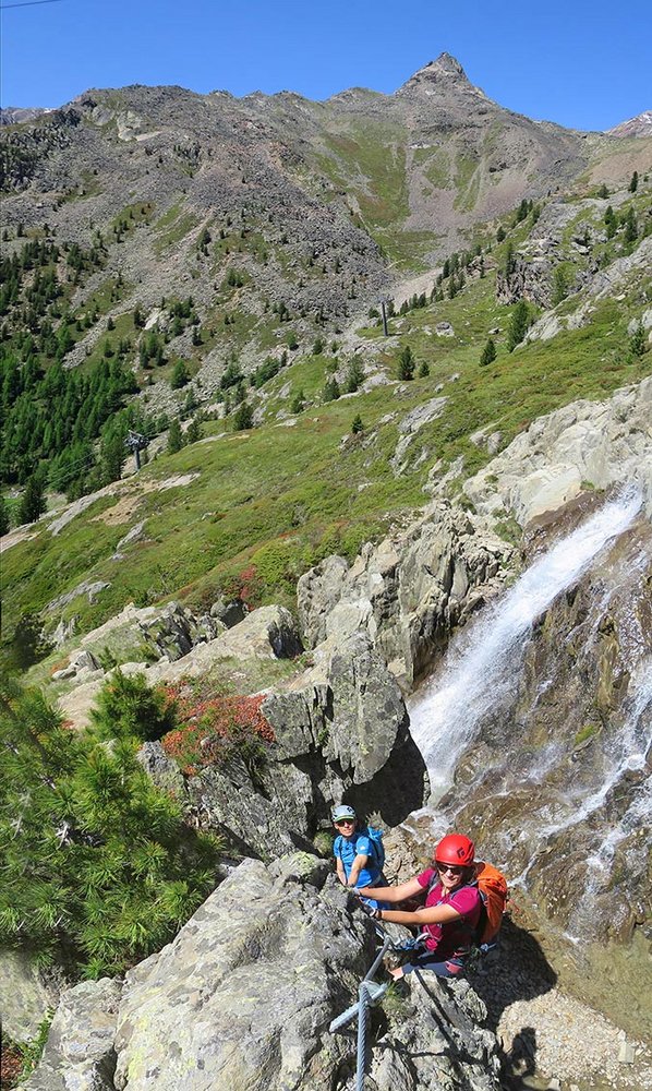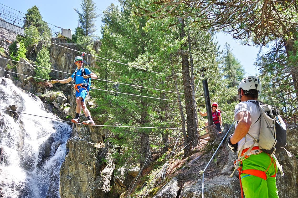 Der Larix Klettersteig ist ein gelungener Action-Familien-Klettersteig im hintersten Schnalstal. In Kurzras befindet sich eine der ältesten und größten Seilbahnanlagen Südtirols - die Schnalstaler Gletscherbahnen, die bis auf 3212 m hinaufführen. Im landschaftlich schönen Tal, links der Seilbahn, wurde ein interessanter Familienklettersteig mit vielen Seilbrücken, zwei Himmelsleitern und einer Tyrolienne errichtet. Im ersten Teil führt die Larix Ferrata über und entlang eines kleinen Baches und bietet reichlich Action, unterbrochen durch kurze Gehpassagen. Im oberen Teil, ab dem Rotkofelsee, verläuft sich die Ferrata hingegen ein wenig und bietet nur noch drei kurze und eher flache Klettersteigpassagen. Ein gelungener 2 1/2 km langer Mix aus Gebirgswanderung und Genuss-Action-Ferrata, die vor allem Einsteiger und Familien mit kletterfreudigen Jugendlichen begeistert.