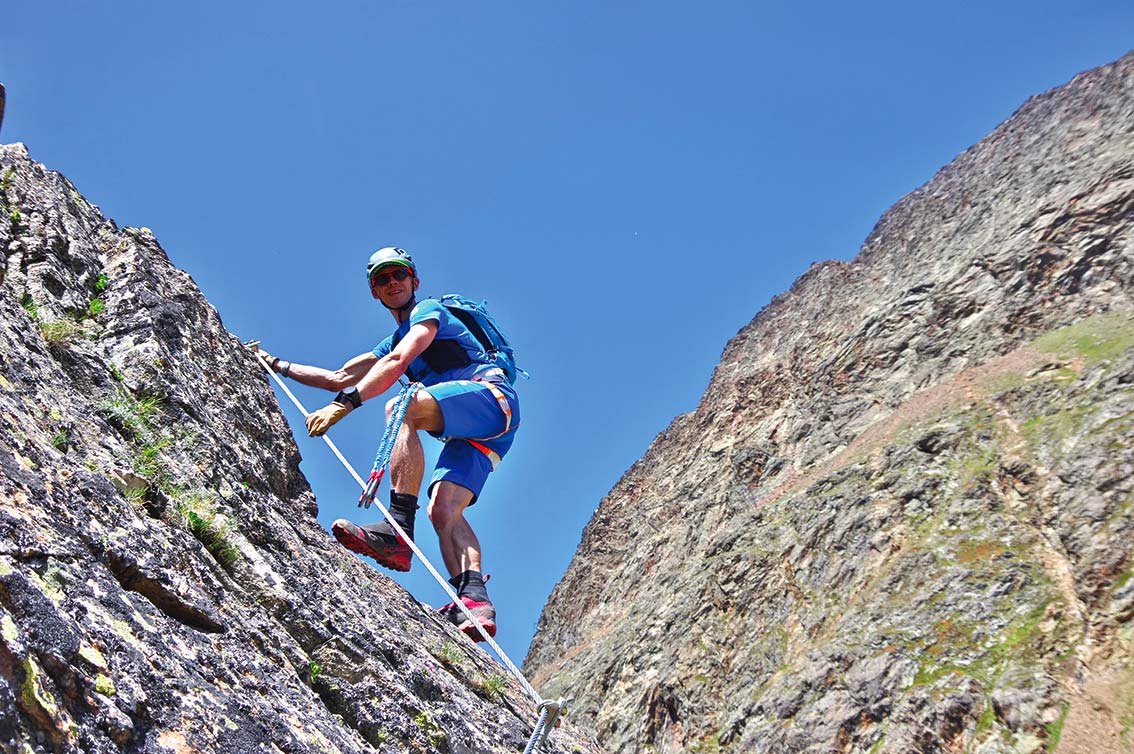 Komplette Klettersteigausrüstung, Klettersteighandschuhe und Helm. Der Höhe und Länge des Steiges entsprechende Kleidung wählen.