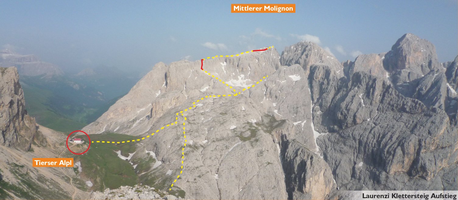 Der hier beschriebene Laurenzi Klettersteig bildet die Überschreitung des Molignonkammes auf einem teils sehr schmalen, ausgesetzten Grat. Der Klettersteig ist ernst zu nehmen und erfordert Kletterkönnen (Trittsicherheit und alpine Erfahrung). Die schwierigste Stelle des vom Errichter des Tierser Alpls 1986 erbauten Steiges wartet am Ende des Abstieges, kurz vor dem Antermoia See - eine kurze, aber sehr steile Wandstelle muss abgeklettert werden.