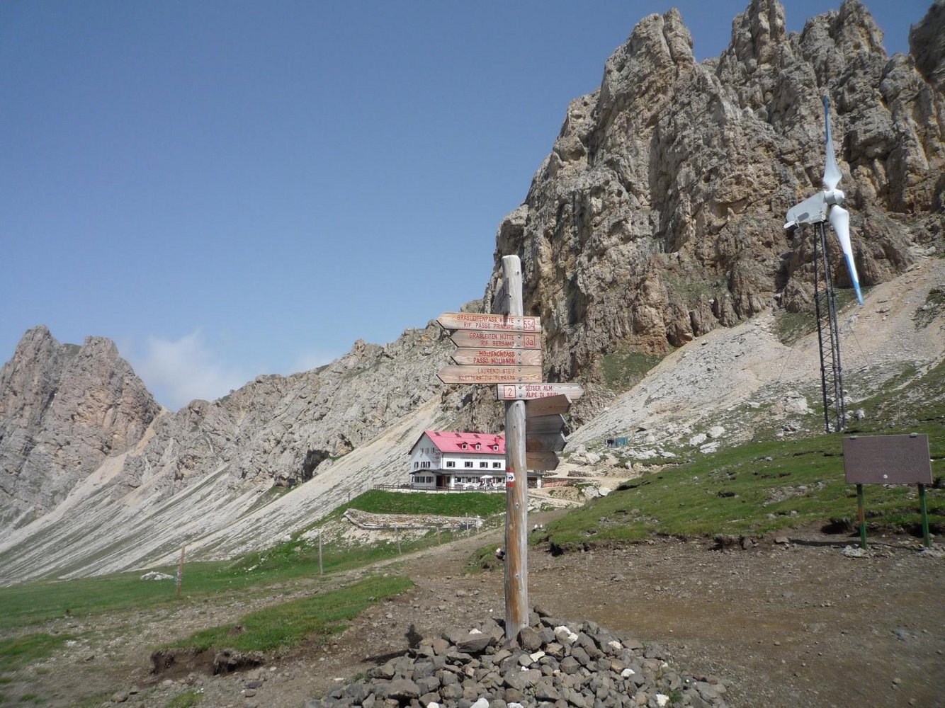 Hinunter zum Weg 584 oberhalb des Antermoia Sees und rechts über den Passo de Antermoia zum Grasleitenpass. Auf dem Weg 554 über den Molignon Pass zum Schutzhaus Tierser Alpl zurück (2 Std. bis Hütte) und nach Kompatsch absteigen (1 ½ Std.). Wer vom Val Duron kommt geht auf dem Weg 584 links zum Rif. Antermoia, folgt kurz dem Weg 589 und zweigt bald links auf den Weg 578 ins Tal ab (3 Std). Nach Tiers gelangt man über den Weg 584 zum Grasleitenpass. Abstieg auf dem Weg 3A über die Grasleitenhütte nach St. Cyprian (3 Std.).