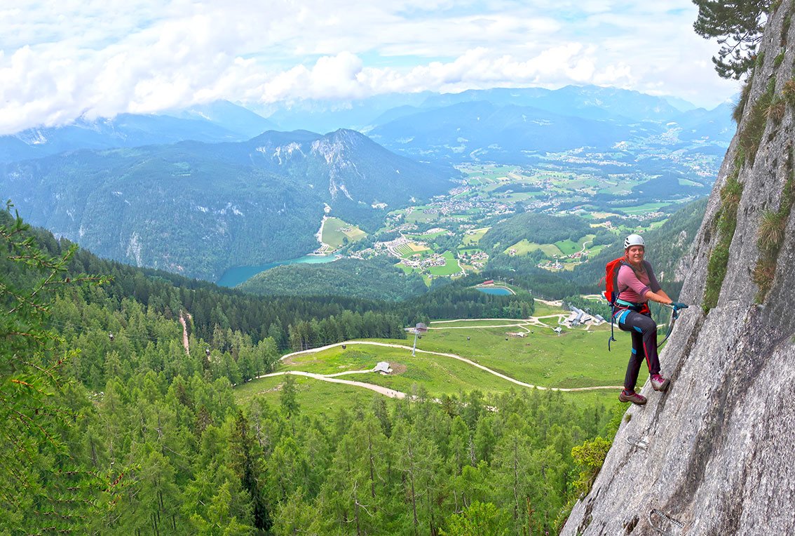 Mit dem Laxersteig hat der leichte (B) und sehr beliebte Schützensteig am Kleinen Jenner hat einen kräftigen Bruder bekommen. Der Laxersteig beginnt etwas tiefer als der Schützensteig und schlängelt sich an einigen steilen und glatten Felspassagen bis zum Einstieg des Schützensteiges heran. Am Ende geht man am besten auf dem Schützensteig wieder bis zum Kleinen Jenner - so kommt eine doch etwas längere Ferrata-Kombination zustande. Am Ende kann man vom Gipfel den perfekten Ausblick auf Watzmann, Berchtesgaden und den Königssee genießen.