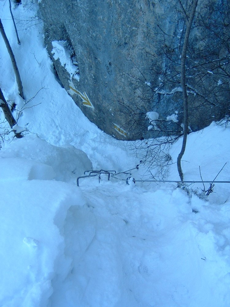 Vom Heurigen Ramhof bzw. vom Parkplatz danach auf gelb bezeichnetem Weg, links am Teufelsgrat vorbei, zum Beginn der Steighilfen. Über diese (30m) in der Schlucht empor und weiter bis zur Straße.