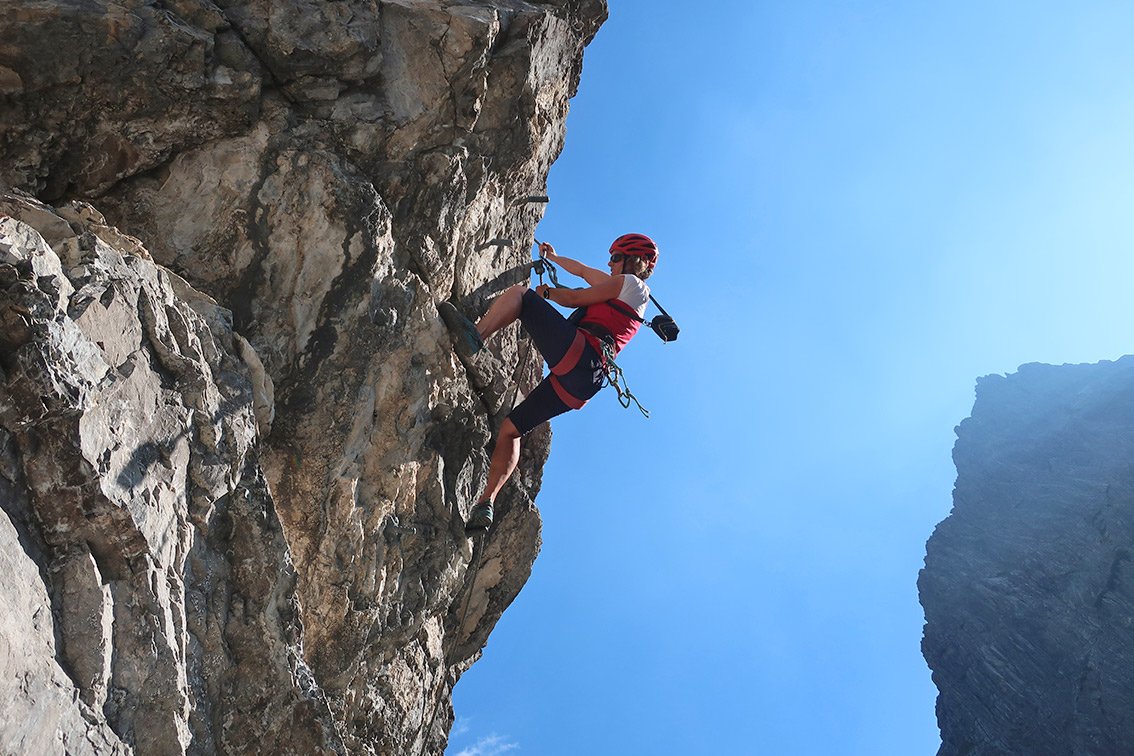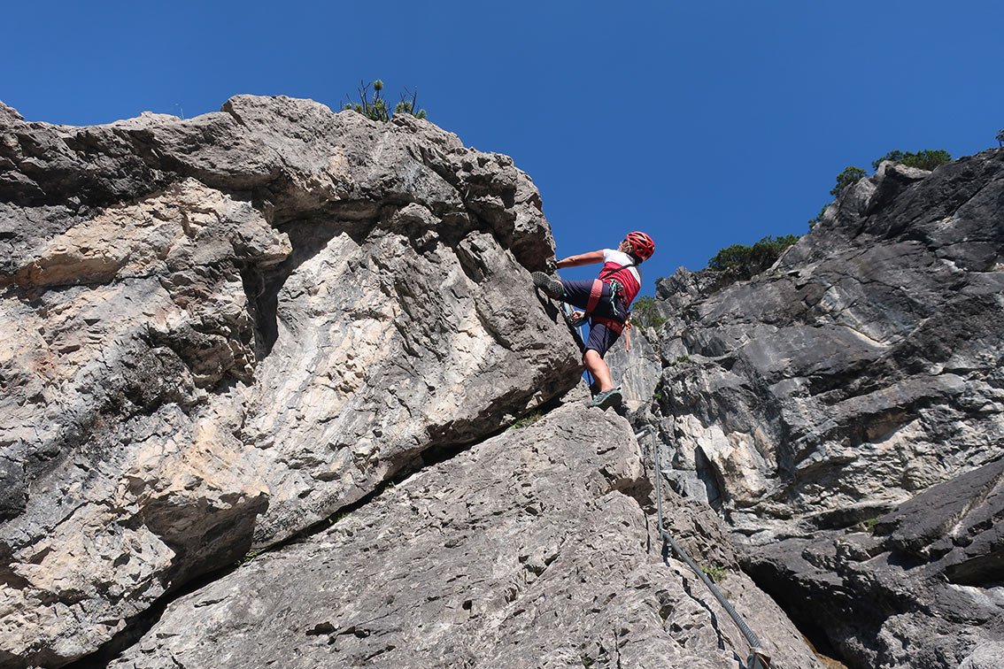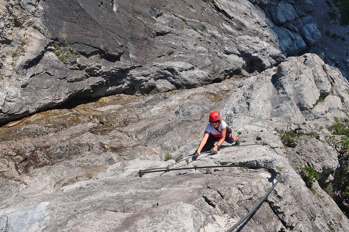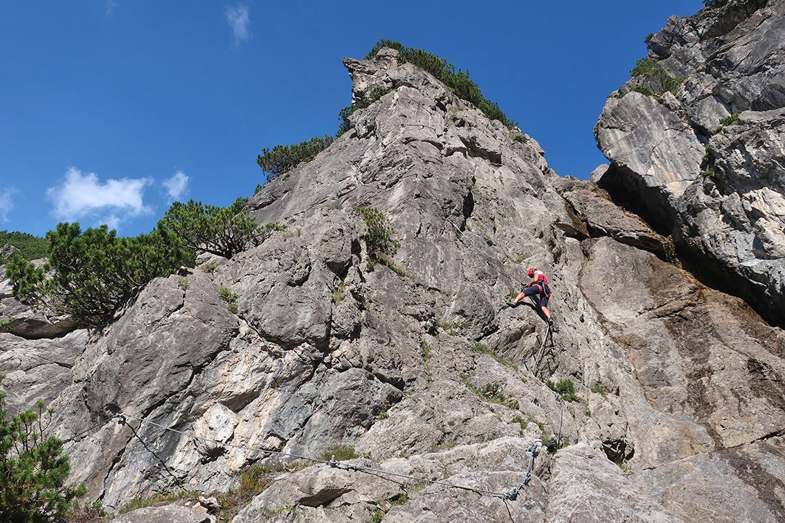 Komplette Klettersteigausrüstung und Helm; für schwächere Geher ein Sicherungsseil.
