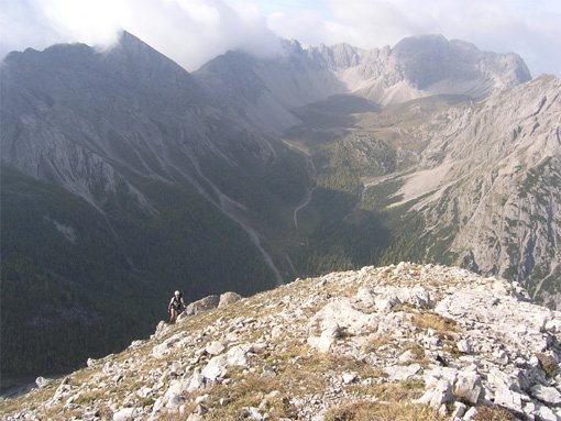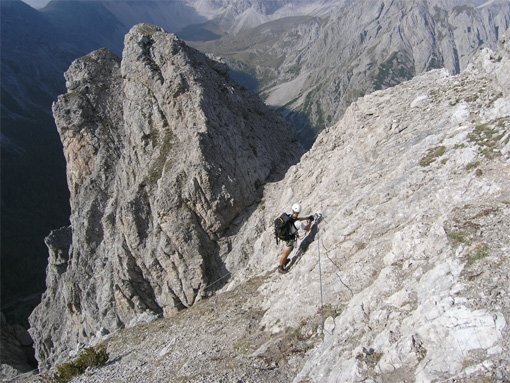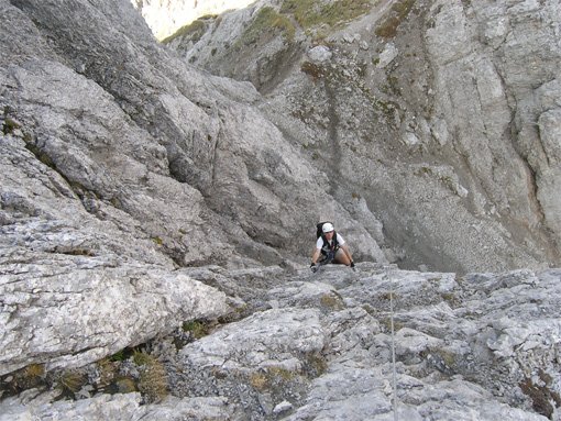 Vom Ausstieg auf ausgetretenem Pfad ein Stück aufsteigen (evtl. in wenigen Minuten zum Gipfel) und anschließend rechts in Serpentinen hinunter in die Gamsscharte. Hier befindet sich ein Notabstieg nach rechts.