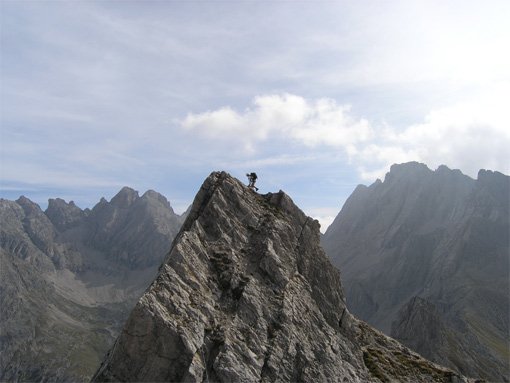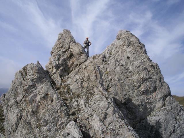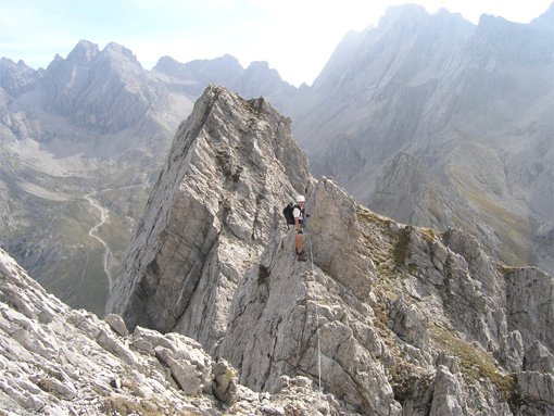 2. Teil (Kleine Gamswiesenspitze - 110 hm): Von der Gamsscharte auf einen Felskopf (zuerst B, dann B/C). Über die steile Platte (B/C) geht es auf den Zackengrat. Nachdem der erste Gipfel (A/B) erklommen ist, steigt man in eine kleine Scharte ab (B/C). Leicht rechts vom Grat (B) wird der Ausstieg auf der Kleinen Gamswiesenspitze erreicht.