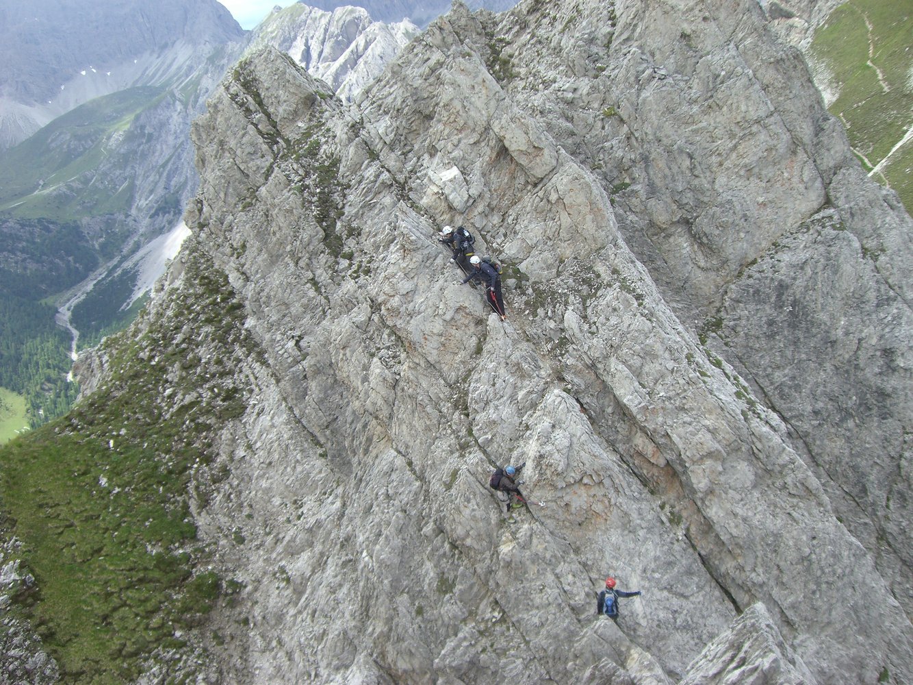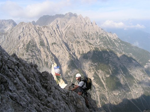 Komplette Klettersteigausrüstung und Helm, evtl. Klettersteighandschuhe, im Frühjahr evtl. Steigeisen, Pickel und ein zusätzliches Sicherungsseil.