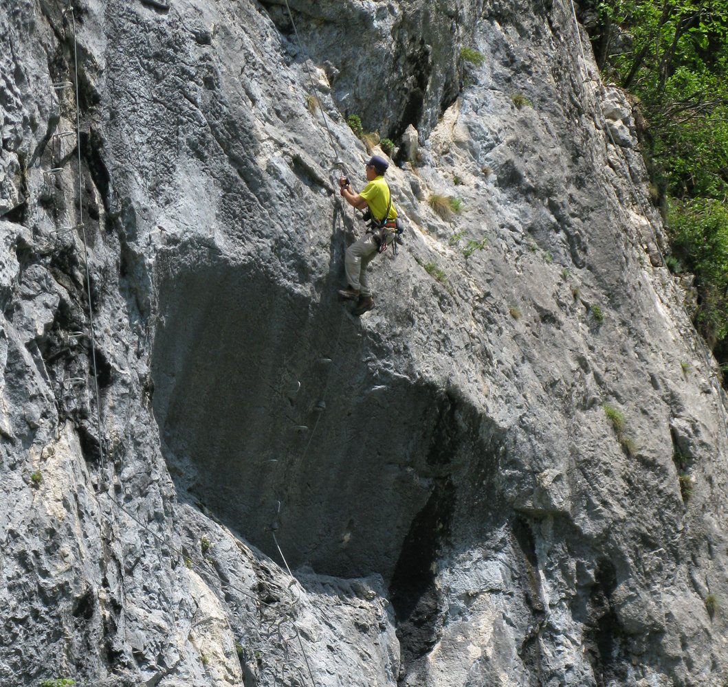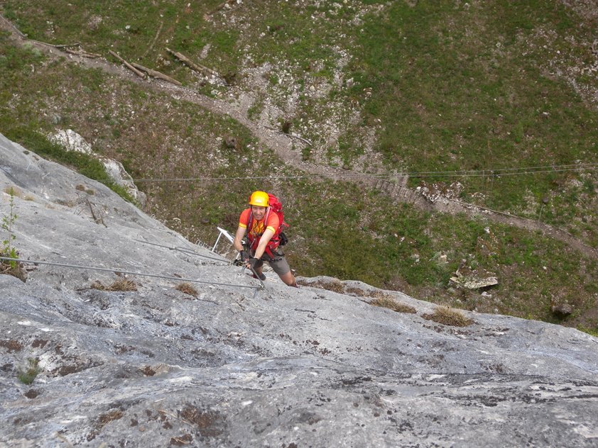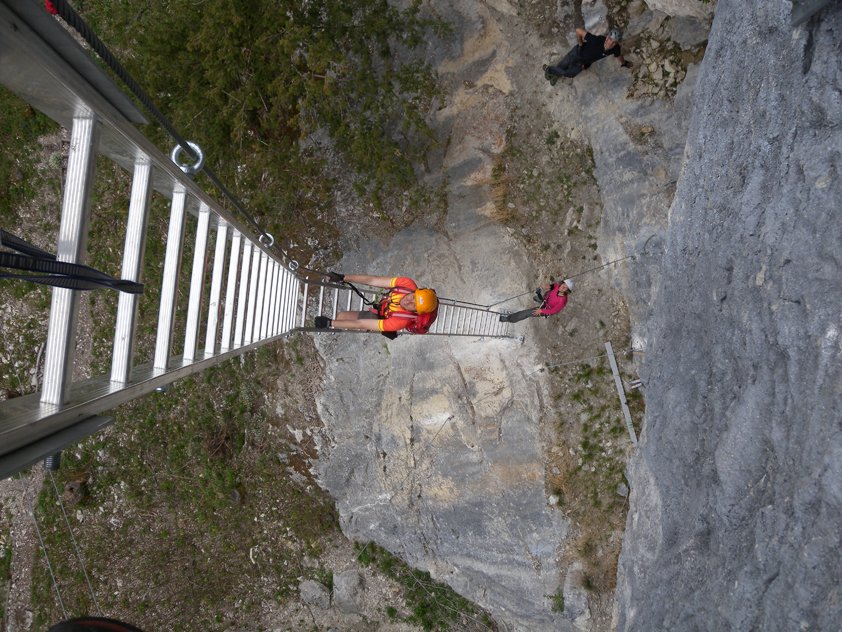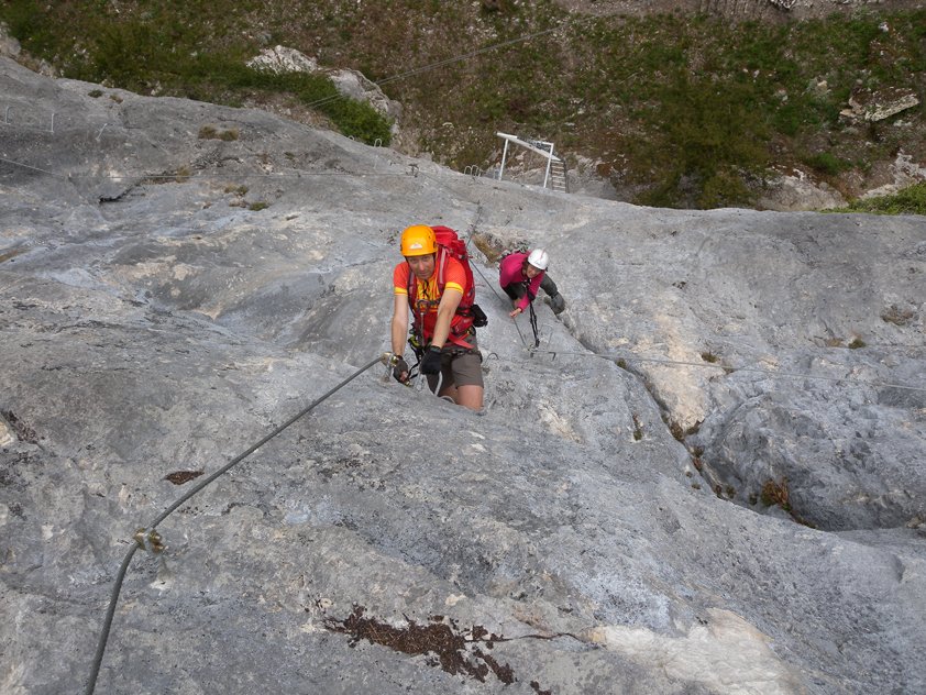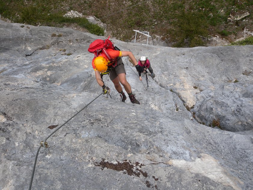 Nach dem Aufwärmen im Feitel Klettersteig (siehe Topo, das ist der beste Zustieg zum Mammut Klettersteig) beginnt der Mammut-Klettersteig mit der langen Seilbrücke (B/C), danach folgt eine Aluleiter (B), an der man auch an der überhängenden Seite hinaufklettern kann (dann E). Vom Ende der Leiter steigt man zu einem kleinen Dach (D) hinauf, welches die Schwierigkeiten (E) quasi einläutet. Danach folgt eine lange E-Passage, die sich nur unwesentlich abschwächt, gegen oben hin wird es mit D etwas leichter, sodass man realistische Chancen hat, auch das Ende zu erreichen.