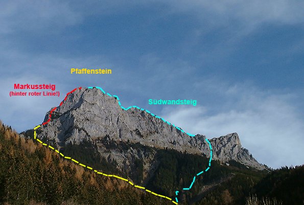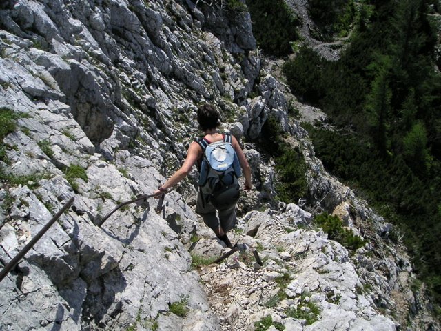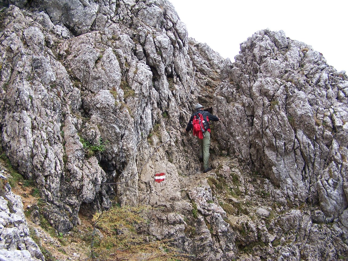 Nach der Eisentreppe (A) beim Einstieg geht es um eine etwas ausgesetzte Kante (A). Anschließend führen einige Holzstufen (A) zu einer Geröllrinne hinab. Nach einer Querung (A) wird mit einer etwas ausgesetzten Felsstufe (A/B) der Ausstieg erreicht. Durch die latschenbewachsene Nordflanke gelangt man zum Gipfel. Der Weg ist markiert und ausgeschildert.