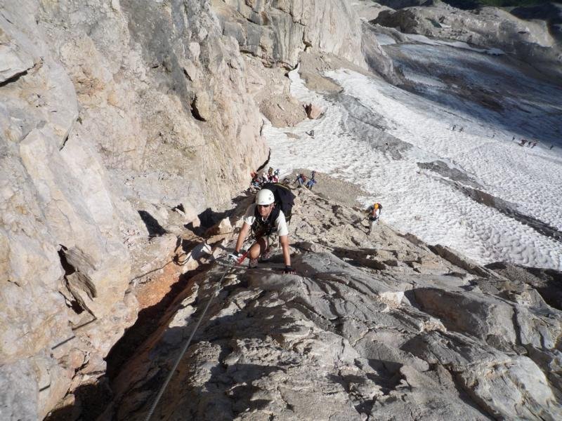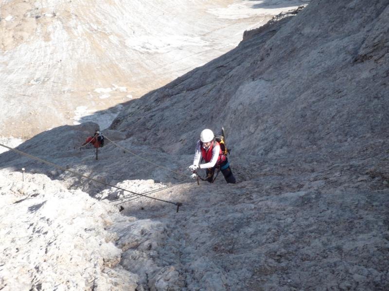 Von der glatten, etwas sandigen Einstiegsstufe (A/B) durch eine seichte Verschneidung (A bis A/B) in die Forcella de la Marmolada (2896 m, dort führt der Weg 606 kurz mit Seilen gesichert in die Schutthalde und weiter zum Rif. Contrin hinunter). Auf Klammern (A) zu einem Stück Gehgelände über einen schuttbedeckten Rücken, welcher zu einem Grat (A) leitet. An dessen Ende von einer Nische eine kurze, fast horizontale Querung in die Nordflanke (A). Eine kurze Steilpassage (A/B) aufwärts, dann mit Hilfe einiger, teils recht luftigen, aber leichten Klammernreihen (meist A/B, eine Stelle kurz B) über ausgesetzte Platten zurück auf den Grat. Dort meist direkt auf dem Grat (A, fotogene Passage auf eine abgerundete Gratkuppe) mit kurzen Gegenabstiegen (A bis A/B) zum Ende der Versicherungen. Vom Ausstieg im Geröll oder auf dem Gletscher zum Gipfel (3343 m) mit der Capanna Punta Penia (3340 m) aufsteigen.