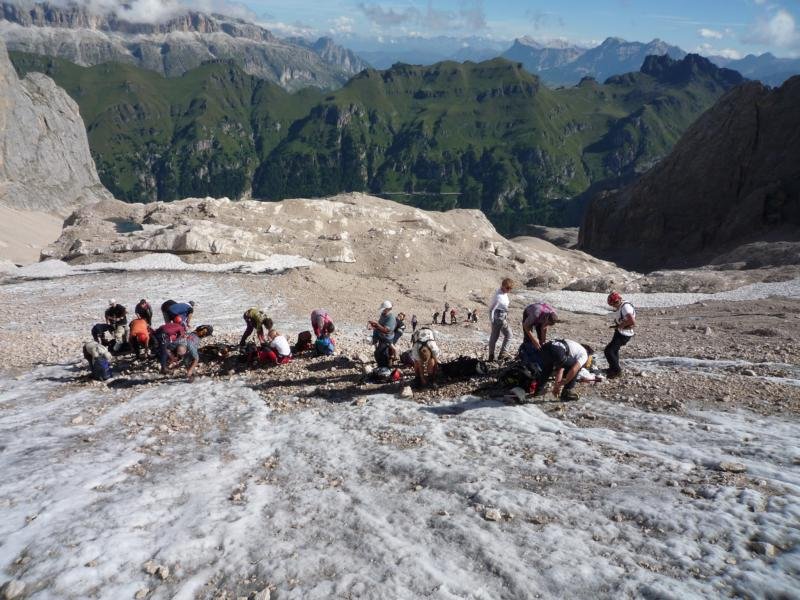 Die Marmolada ist ein Berg der Superlative: Der höchste Berg der Dolomiten mit dem größten Gletscher und einer gigantischen Südwand. Die über den Westgrat führende Via ferrata della Marmolada (auch als Hans-Seyffert-Weg bezeichnet) ist außerdem einer der ältesten Klettersteige. Die Tour ist ein perfekter Mix aus Ferrata und Gletscherhochtour und eines der besten Genuss-Abenteuer in den Dolomiten!. Wie so oft in den Dolomiten sind die Höhepunkte der Tour nicht auf dem Klettersteig zu finden, sondern ergeben sich durch das berwältigende Panorama. Besonders beeindruckend ist der Blick auf den Gletscher mit dem unterhalb liegenden Fédaia Stausee zur linken und die 800 m hohe Südwand zur rechten Seite.