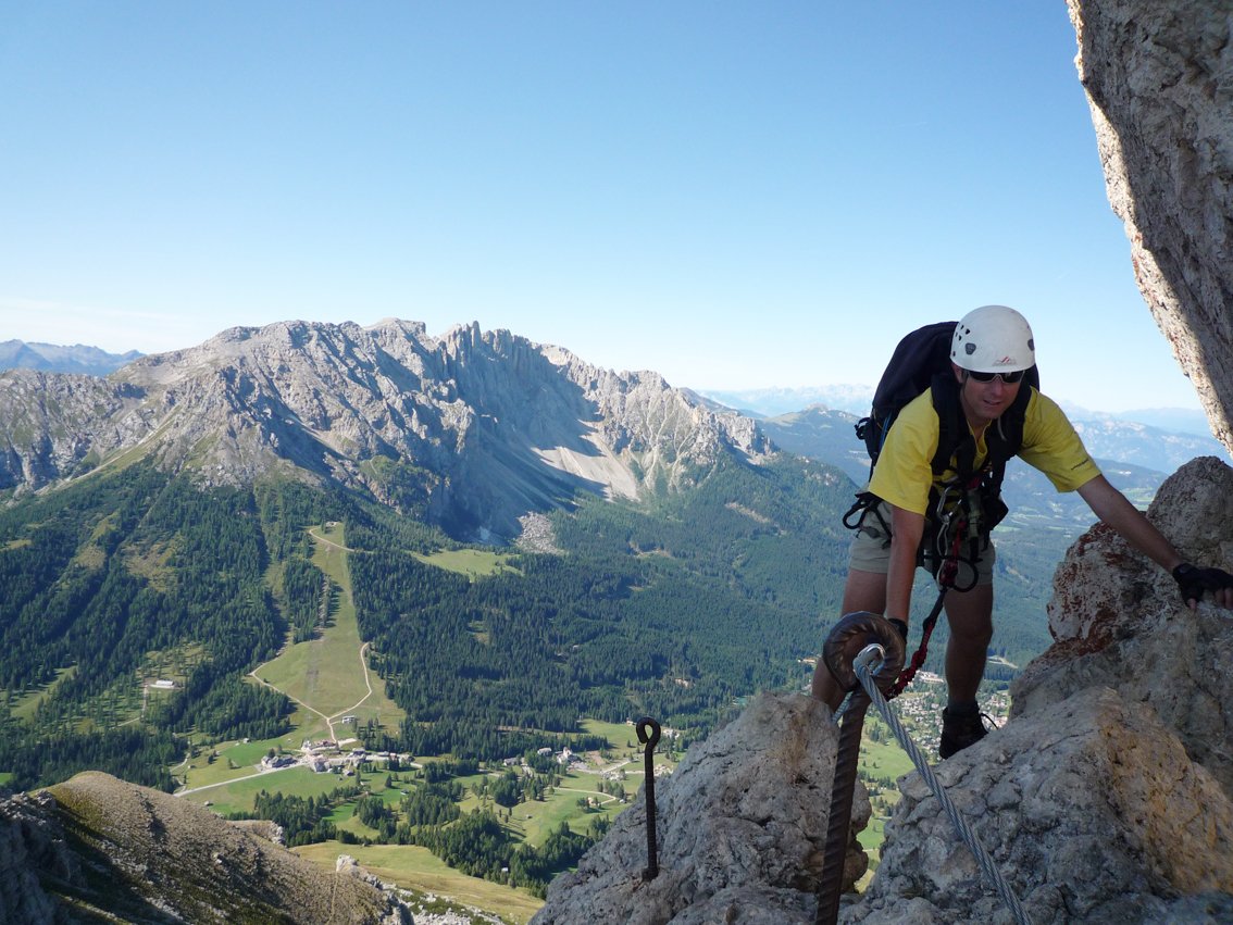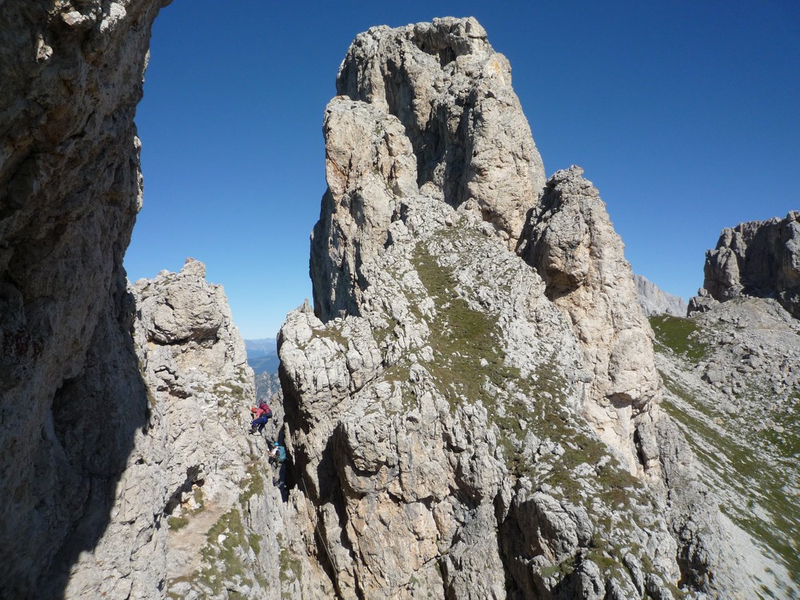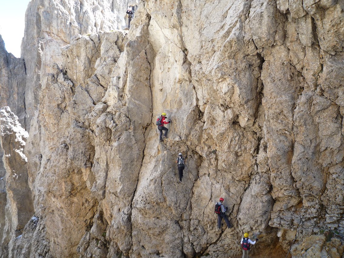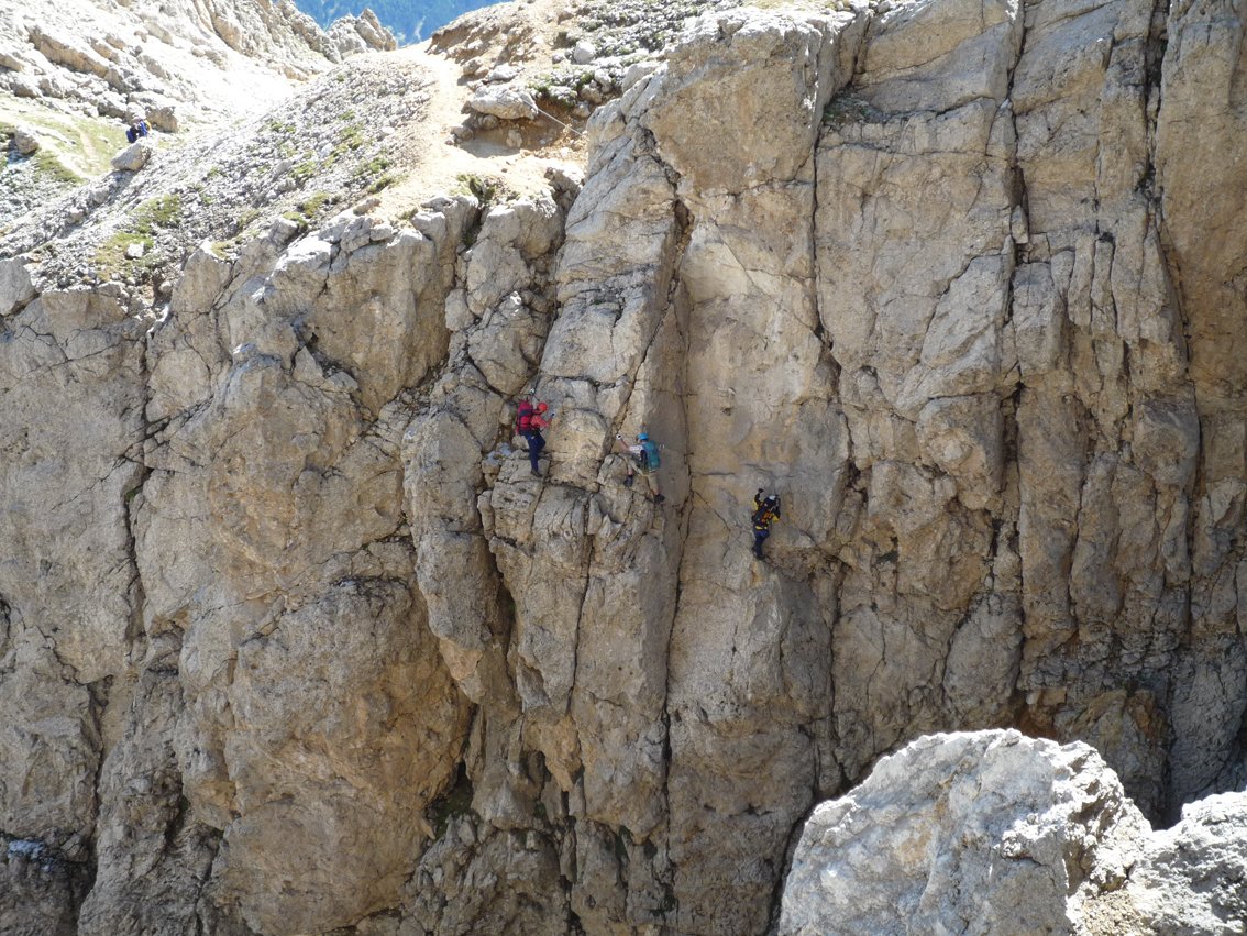 Vom Einstieg leicht hinter einem Turm auf Geröll vorbei, bis die Versicherungen (A/B) zu einer schwierigen 10 Meter Wand (B/C) leiten. Danach eine leichte Querung zu einem engen Kamin, durch den man auf Eisenstufen 8 m absteigt (C), kurz leicht nach links unter die Torre de le Stries queren, steil wieder 8 m (C) hinunter und leicht zu einem Gehstück, das zur nächsten Wand führt. Leicht (A) geht es zu einem steileren Abstieg (B). Danach eine U-förmige Querung (A) zu einem Spalt mit schönem Ausblick nach Westen. Dann ein homogener Abstieg (durchgehend B, am Ende etwas leichter) hinunter zu einem Wiesenkar, das zum Fensterlturm hinaufzieht. Das Wiesenkar waagrecht zur anderen Seite queren, zu einer Tafel unterhalb des Fensterlturmes. Dort entweder links entlang der Felsen aufwärts (Rotwandüberschreitung) oder rechts den Steig beenden, wobei auf dem Weg zur Hütte noch ein enger Spalt (B/C) mit Trittleiter und ganz zum Schluss eine etwas rutschige Wandstelle (B/C) überwunden werden muss.