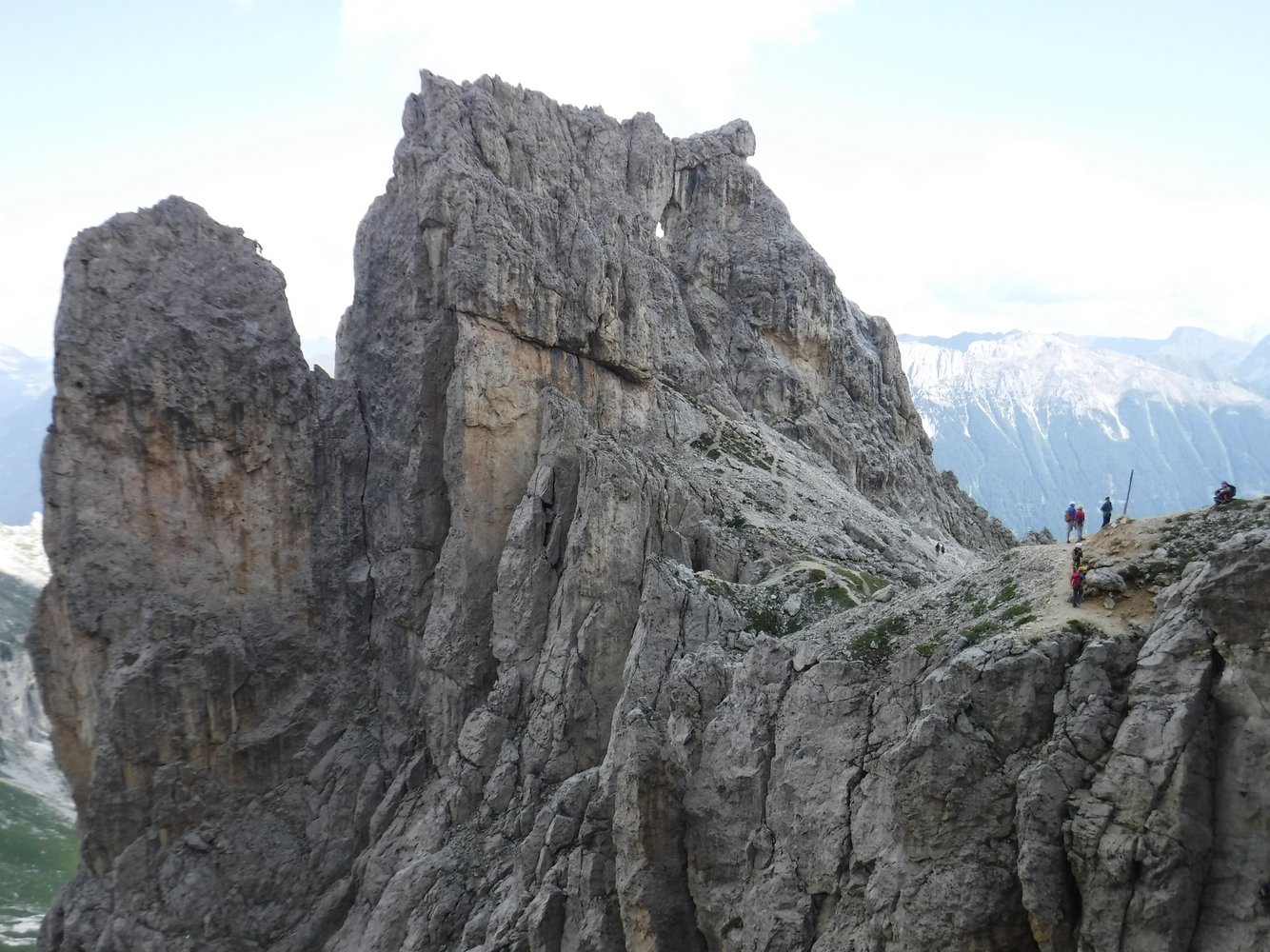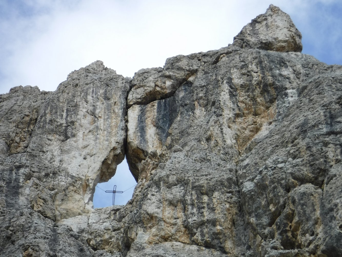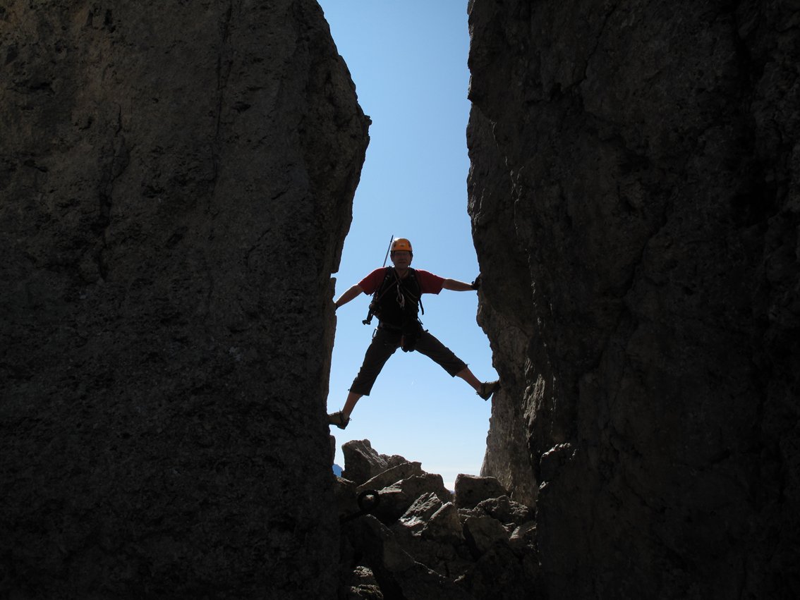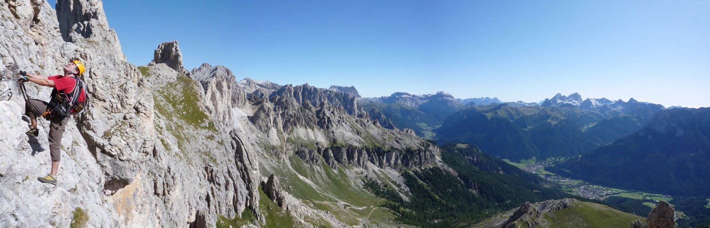 Vom Einstieg leicht hinter einem Turm auf Geröll vorbei, bis die Versicherungen (A/B) zu einer schwierigen 10 Meter Wand (B/C) leiten. Danach eine leichte Querung zu einem engen Kamin, durch den man auf Eisenstufen 8 m absteigt (C), kurz leicht nach links unter die Torre de le Stries queren, steil wieder 8 m (C) hinunter und leicht zu einem Gehstück, das zur nächsten Wand führt. Leicht (A) geht es zu einem steileren Abstieg (B). Danach eine U-förmige Querung (A) zu einem Spalt mit schönem Ausblick nach Westen. Dann ein homogener Abstieg (durchgehend B, am Ende etwas leichter) hinunter zu einem Wiesenkar, das zum Fensterlturm hinaufzieht. Das Wiesenkar waagrecht zur anderen Seite queren, zu einer Tafel unterhalb des Fensterlturmes. Dort entweder links entlang der Felsen aufwärts (Rotwandüberschreitung) oder rechts den Steig beenden, wobei auf dem Weg zur Hütte noch ein enger Spalt (B/C) mit Trittleiter und ganz zum Schluss eine etwas rutschige Wandstelle (B/C) überwunden werden muss.