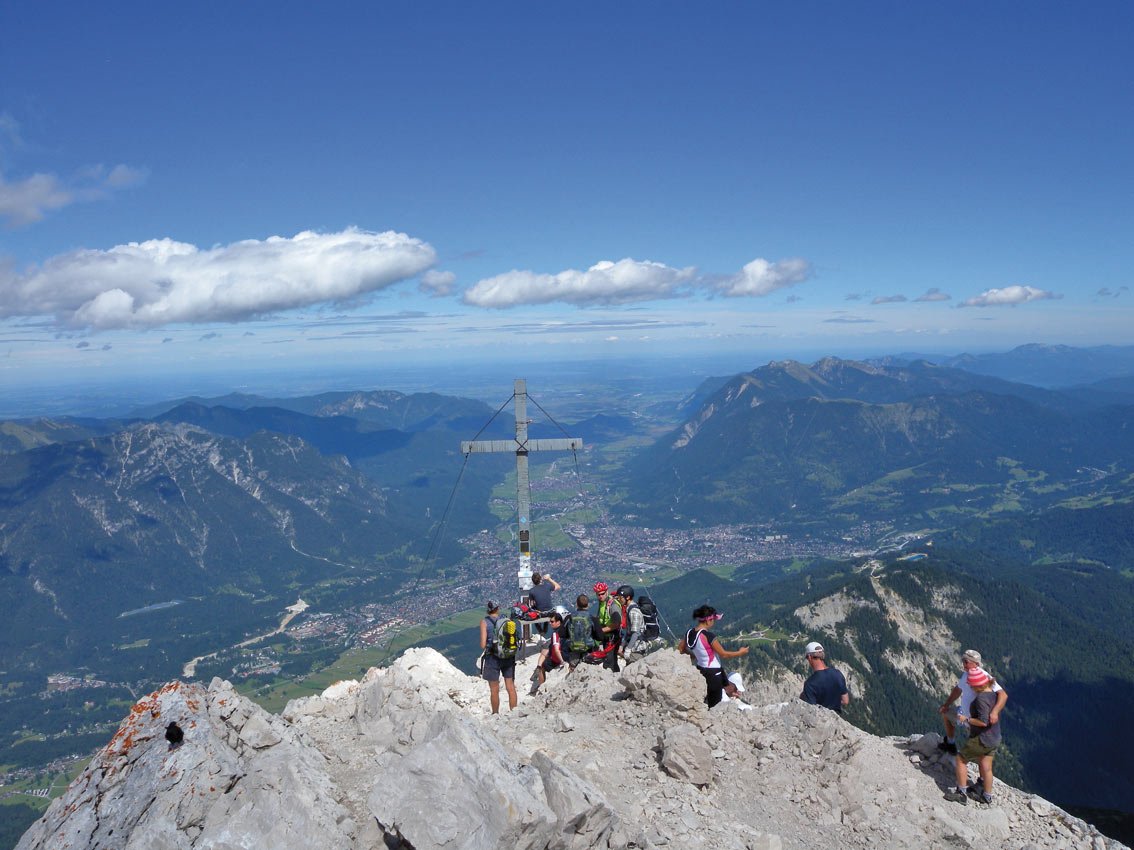 Von der Grießscharte durch das Grießkar zum Stuibensee (1921 m). Kurz davor nach links zum Nordwandsteig (A/B, quert die Nordwand der Alpspitze, führt durch ein Tunnelsystem) oder weiter absteigen und unterhalb des Bernadeinkopfes zurück zum Osterfelderkopf queren. Von der Alpspitze über den Ostgrat (tlw. A/B, kurz 1-, viel Gehgelände) hinunter in das Oberkar. Dann am Nordwandsteig zum Osterfelderkopf. Von der Talstation der Alpspitzbahn mit der Bahn zum Parkplatz.