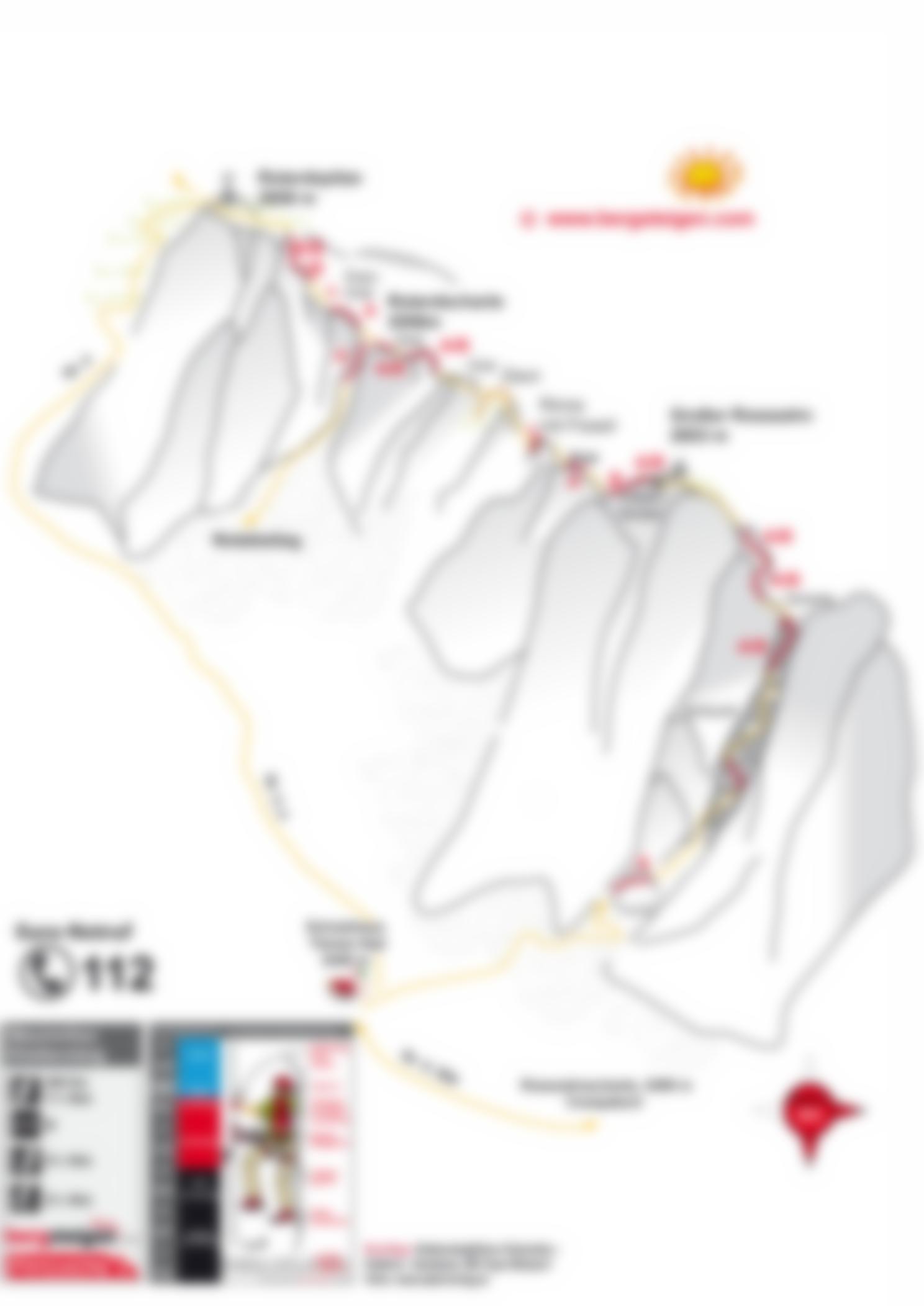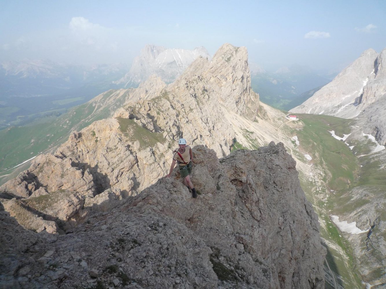 Siehe auch Topo: Vom Schutzhaus Tierser Alpl kurz südseitig hinauf unter die Schlucht zum ersten Seil (A), hinein in die enge Schlucht und hinauf in die Scharte mit schönem Ausblick auf die Seiser Alm (Trittstifte und am Ende versichert). Links weiter zum Gipfelgrat (A/B) und Gipfel des Großen Rosszahn, 2.653 m. Westseitig durch ein Felstor und eine Wandstelle (B) hinunter zum Verbindungsgrat und teils kletternd (1, A) hinüber zur Roterdscharte, 2.556 m (dort Notausstieg und Rückkehr zur Hütte möglich, anfangs A). Anfangs versichert (A) und dann freie Kletterei (1) über den Ostgrat (B) zur höchsten Erhebung des Schlernplateaus, der Roterdspitze, 2658 m, mit großartiger Rundsicht.