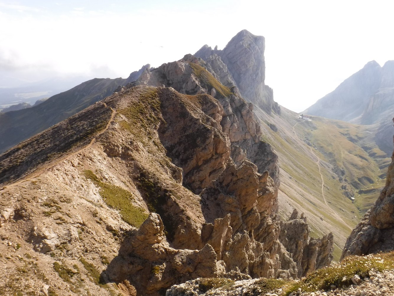 Westseitig kurz mäßig steil abwärts zum Weg Nr. 4 (Schlern - Tierser Alpl), und über diesen wieder zurück zum Schutzhaus Tierser Alpl. Wer die Tour als Tagestour von Kompatsch aus macht, folgt dem Weg Nr. 4 nach Westen Richtung Schlernhaus, 2450 m, und kurz davor rechts über den Touristenweg und Dolomitenweg zurück zur Bergstation des Panorama-Sesselliftes.