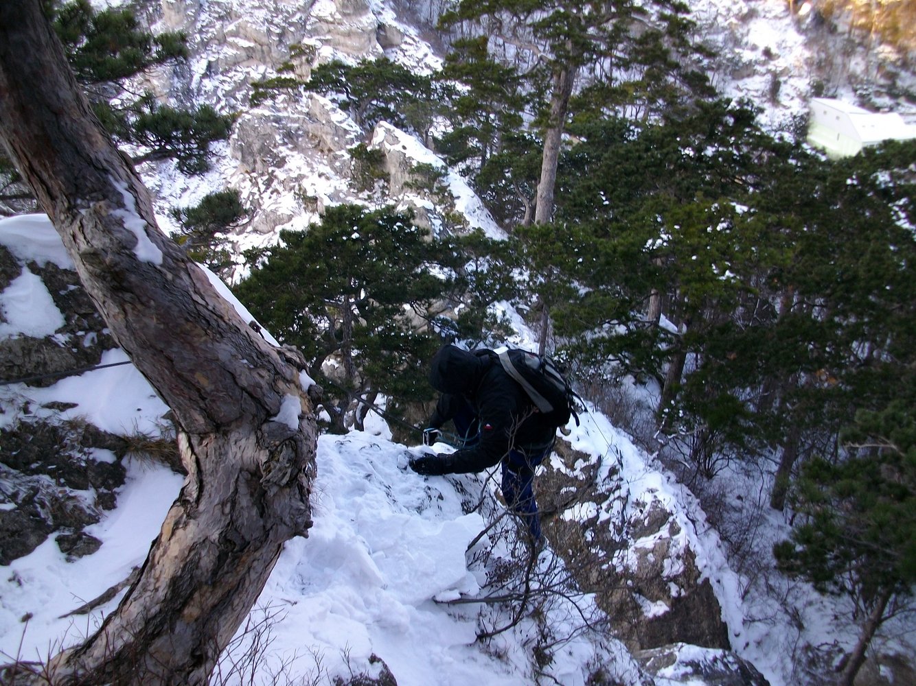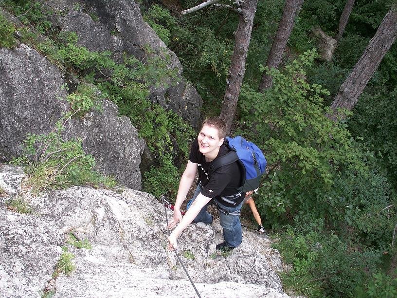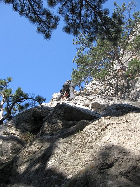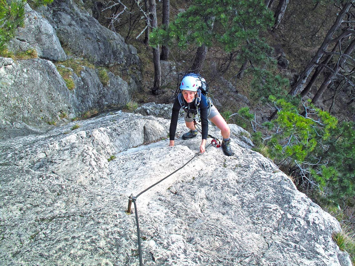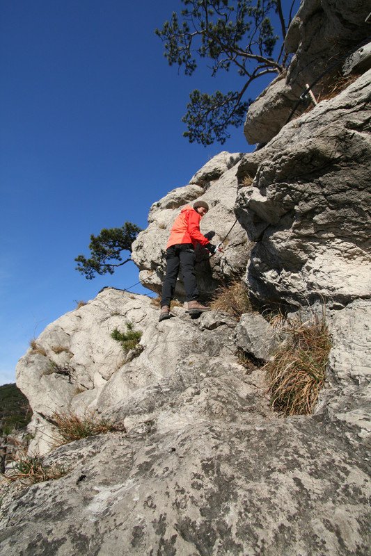 Entlang des Grats weiter (A/B) in den Wald. Mit roten Tafeln markiertes Gehgelände bringt zum finalen mit Eisenklammern gesicherten Aufschwung. Zuerst steil (B), dann flacher (A/B) dem Grat entlang und in Kürze (A/B) zum Ausstieg.