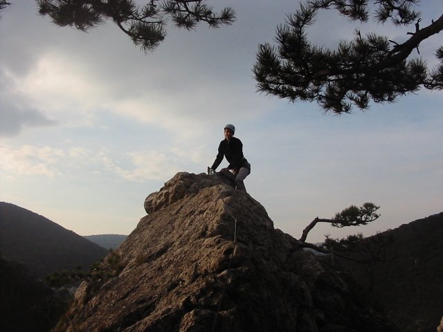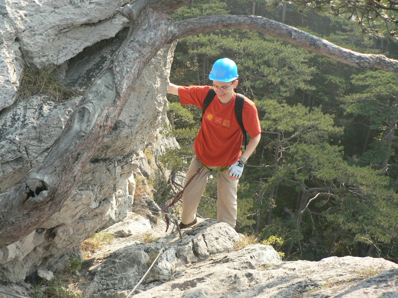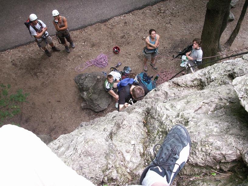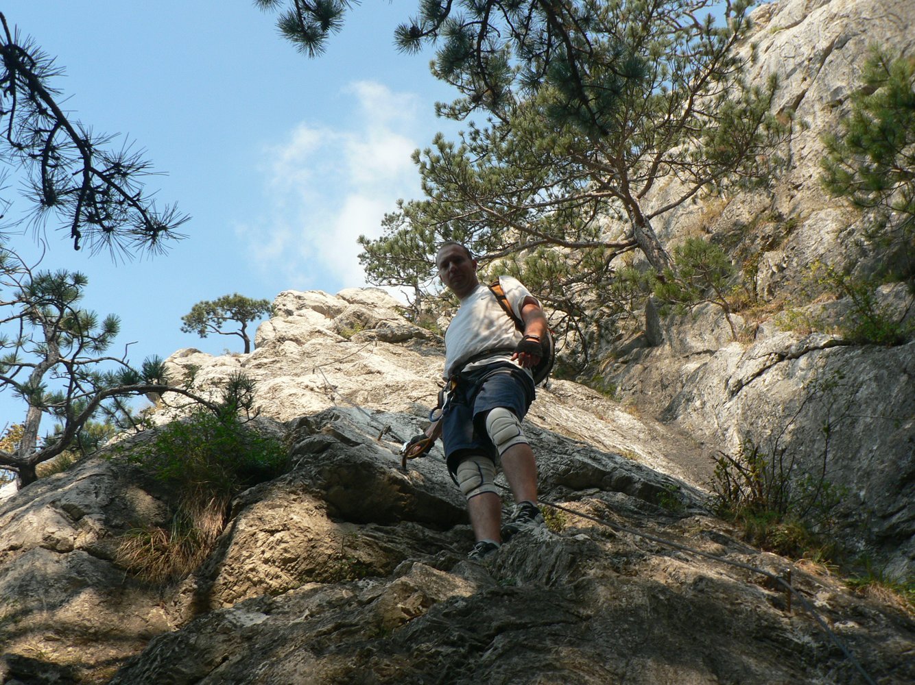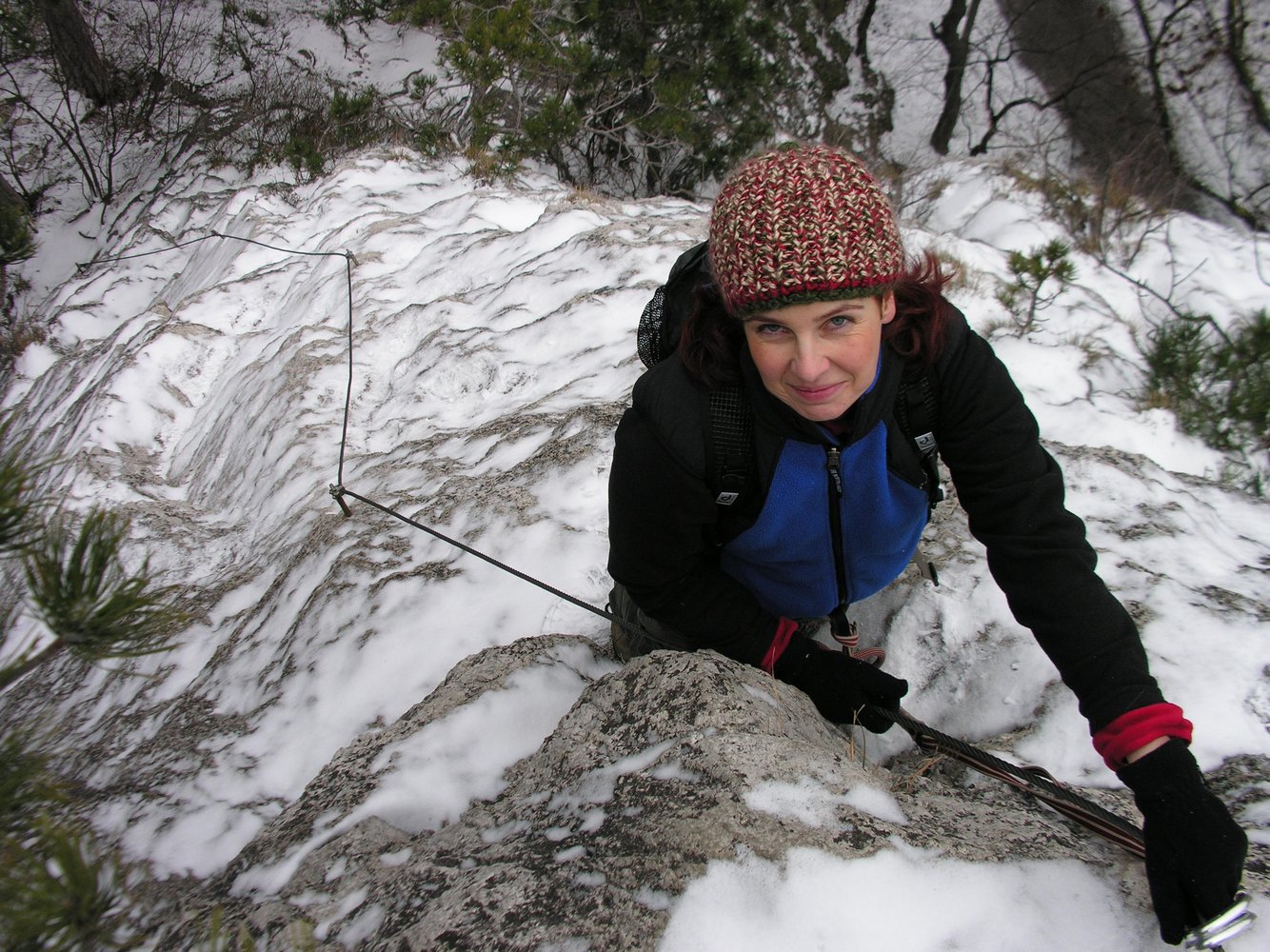 Entlang des Grats weiter (A/B) in den Wald. Mit roten Tafeln markiertes Gehgelände bringt zum finalen mit Eisenklammern gesicherten Aufschwung. Zuerst steil (B), dann flacher (A/B) dem Grat entlang und in Kürze (A/B) zum Ausstieg.