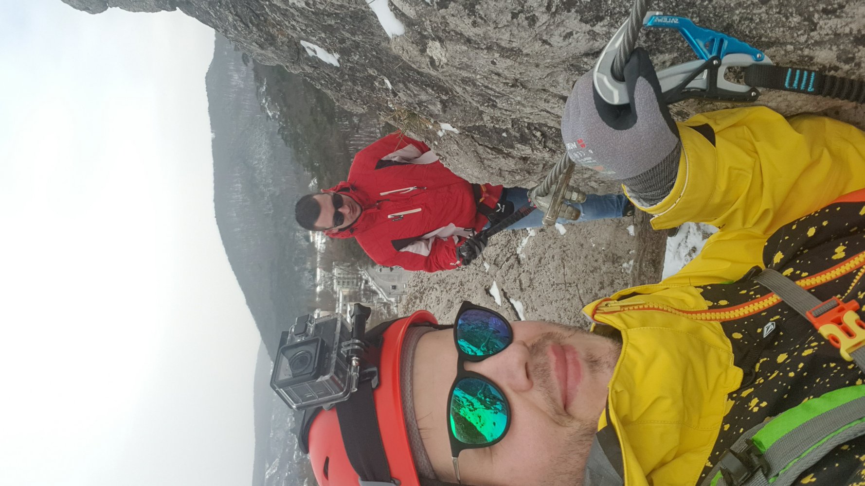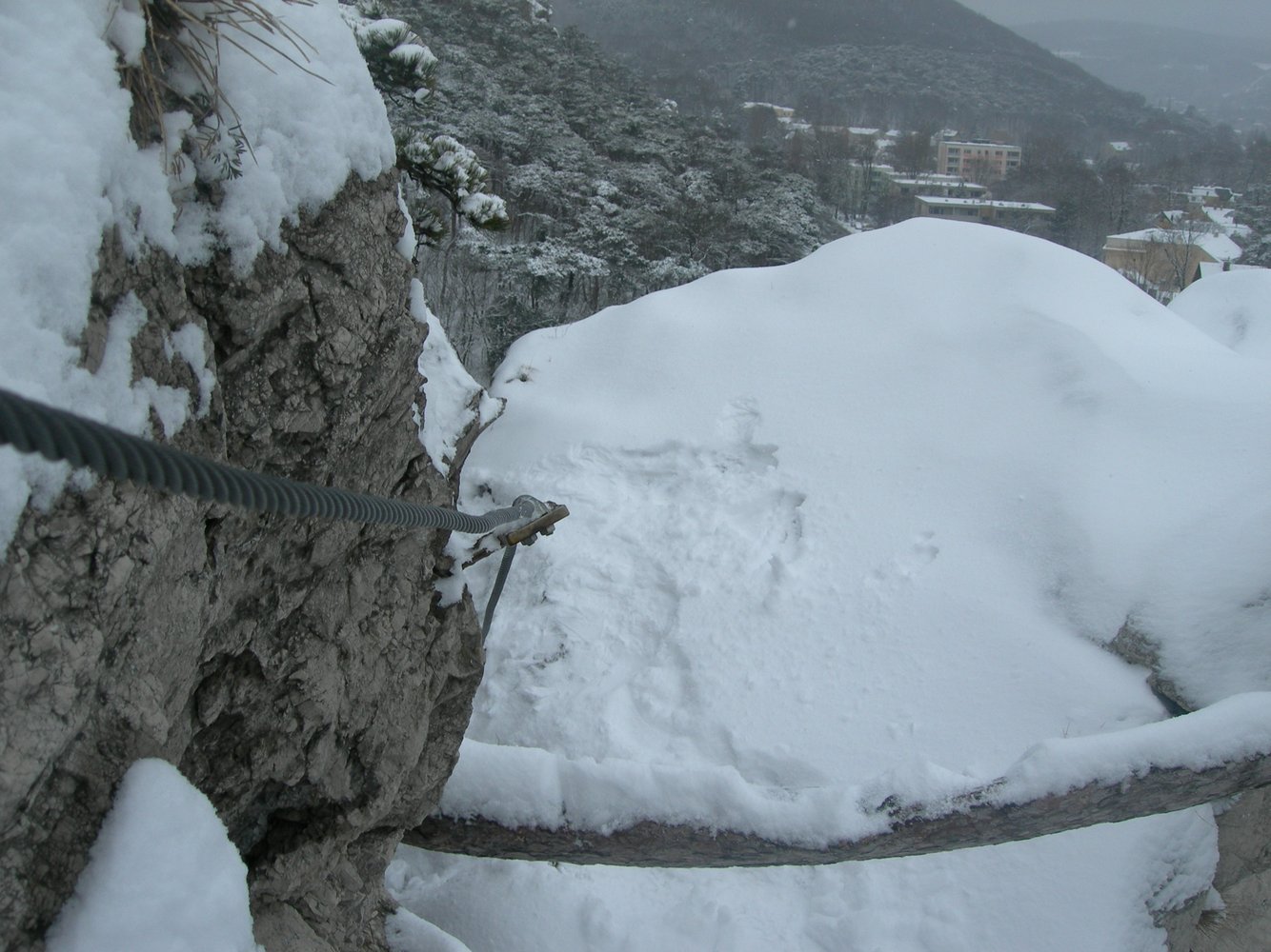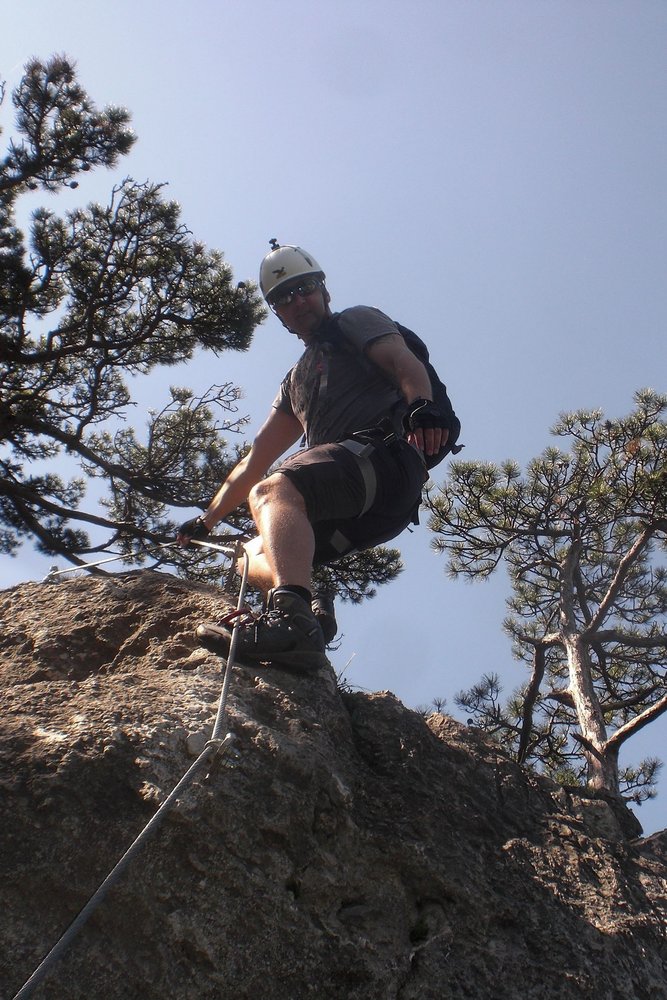 Östlich des Grats aussichtsreich eben weiter (A/B) zu kurzem Gehgelände. Anschließend eine Scharte mit einer kurzen Nepalbrücke, danach kurz steil aus dieser wieder hinauf (B) und schräg nach rechts weiter (A/B) zu einer ausgesetzten Querung (A/B). Durch eine kleine Scharte empor (A/B) zu einem luftigen Türmchen (schöner Rastplatz).