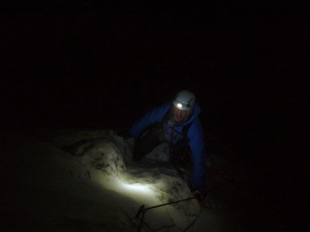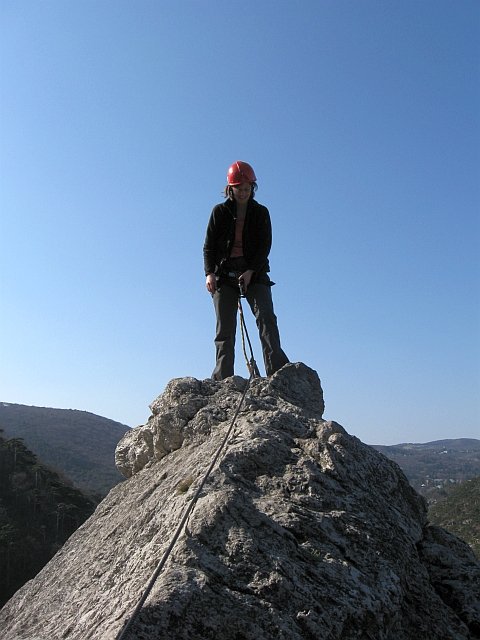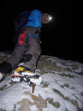 Die steile, sehr glatte, plattige Einstiegswand, welche die Schlüsselstelle darstellt, gerade hinauf (C). Nach rechts (B) zu einem kleinen Überhang (B/C) queren. Danach auf einer schönen Plattenrampe (A/B) und einem ausgesetzten Band (A/B) linkshaltend zu einem exponierten Eck am Grat (schöner Rastplatz).