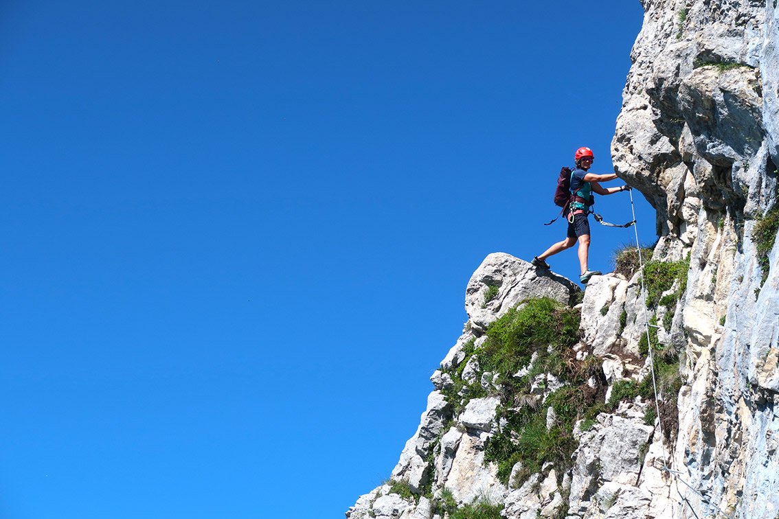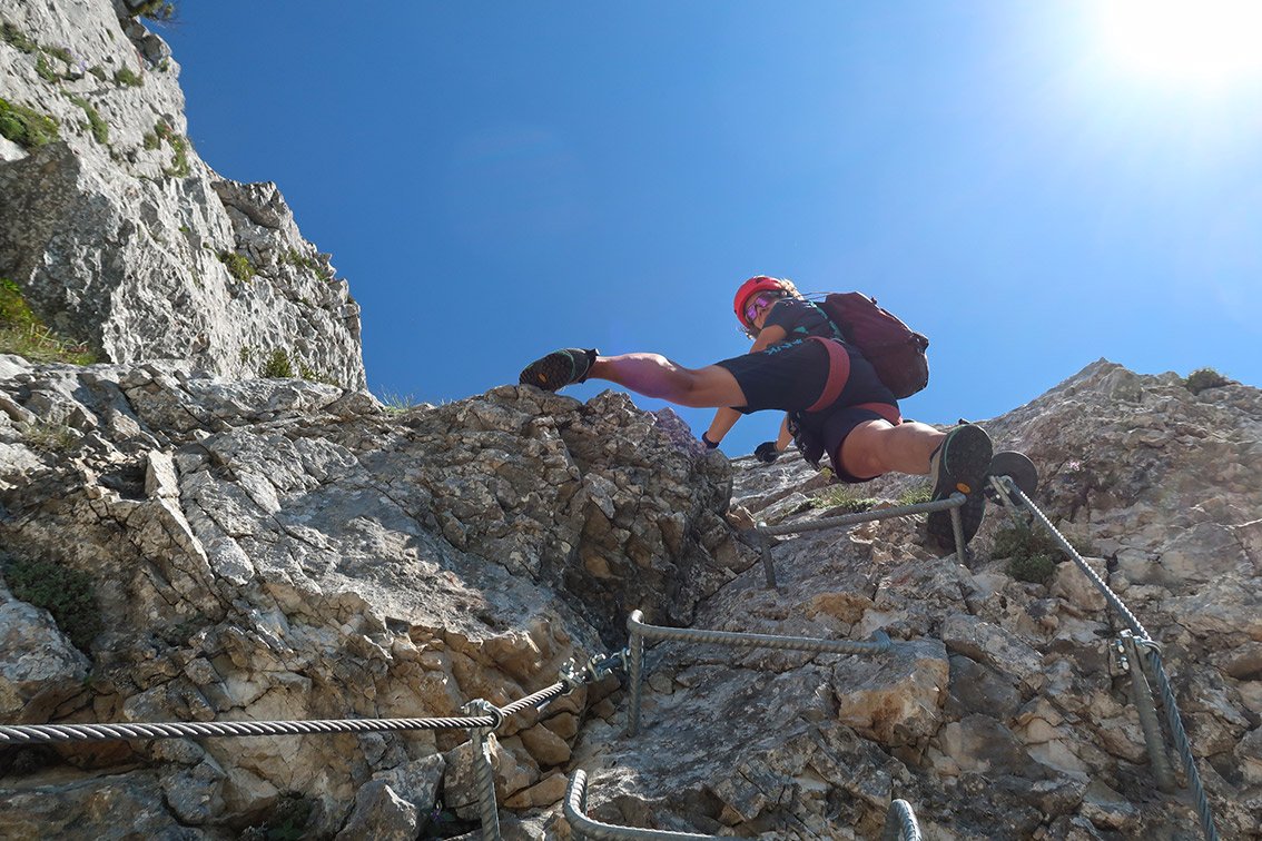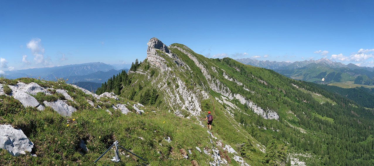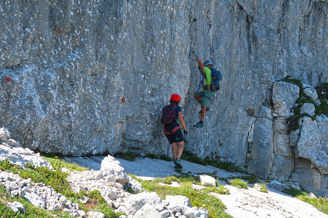 Bei Nässe ist der Steig nicht zu empfehlen - man geht im grasigen Felsgelände auf dem langen Grat zwischen den Klettersteigteilen.