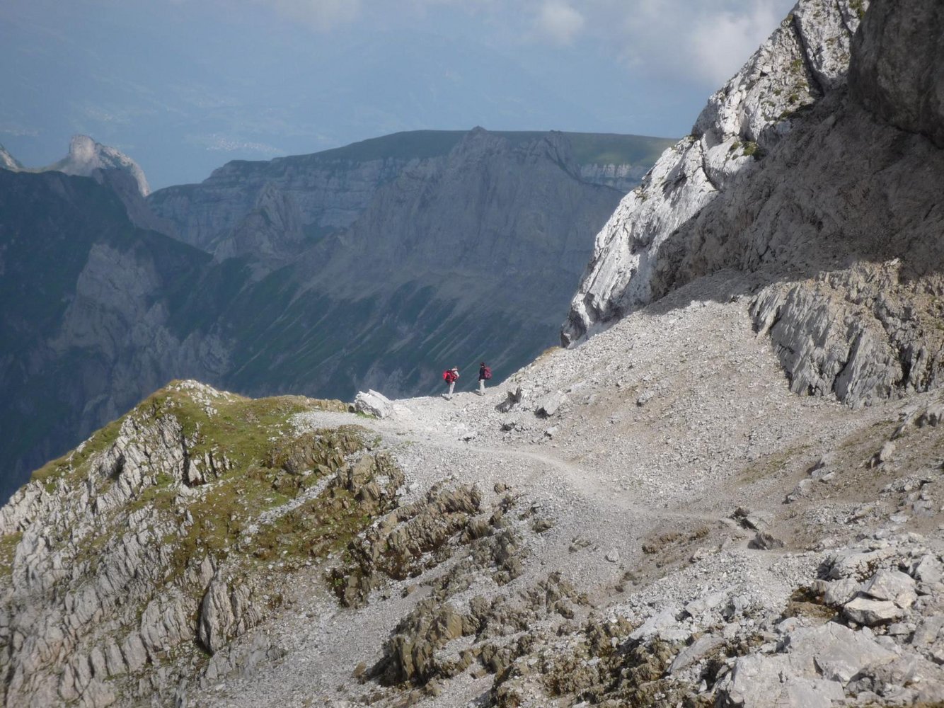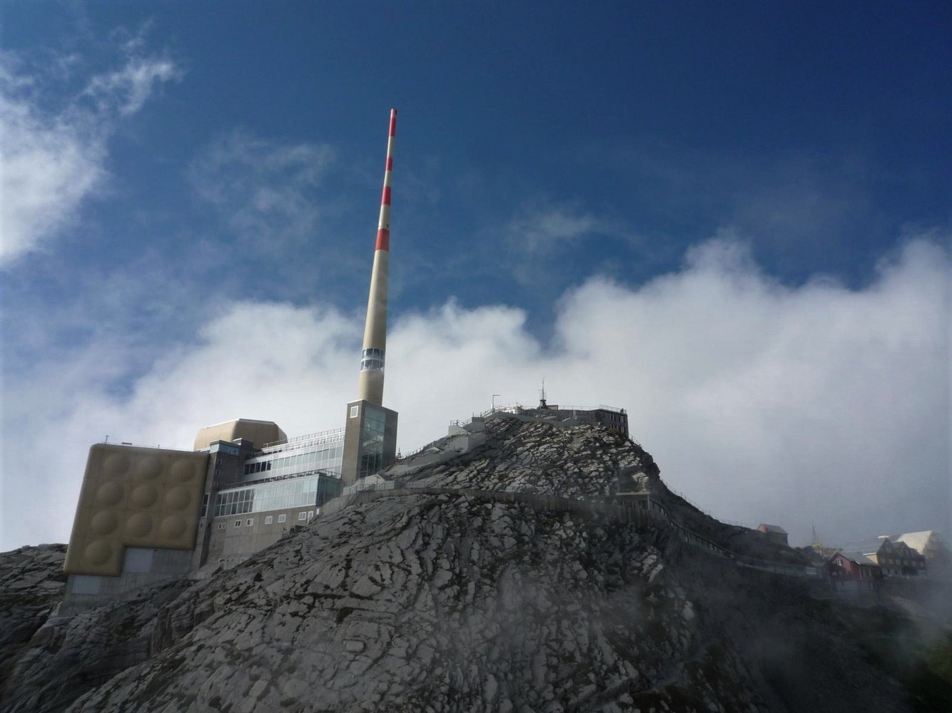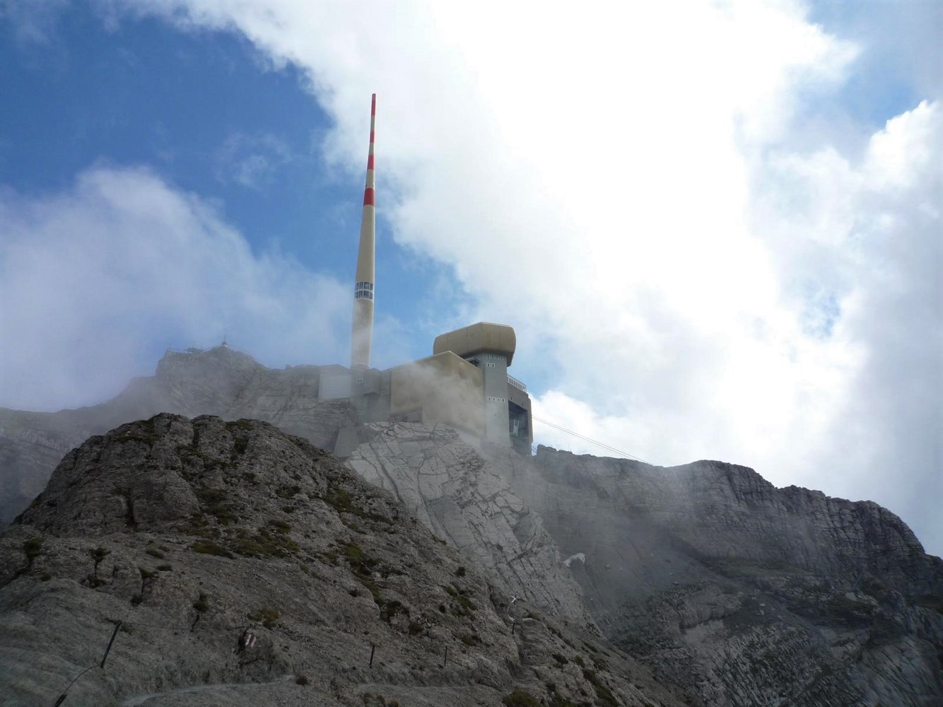 Der exponierte Gipfel des Säntis ist die höchste Erhebung des Alpsteinstocks und beherbergt neben dem einzigen Appenzeller Gletscher seit 1882 eine Wetterstation. Heute ist von Gletscher und Gipfel nicht viel übrig geblieben, den Gletscher hat die Erderwärmung dahingerafft und den Gipfel schmücken die Betonmassen der Bergstation der Säntisbahn und ein 123 m hoher Sendeturm. Nur gut, dass es noch das alte Berggasthaus und ein paar schöne Nebengipfel gibt. Der Aufstieg zum Säntis erfolgt über den Nasenlöcherweg oder von Wasserauen. Über den sehr beliebten und dementsprechend gut besuchten Lisengrat geht es zum Rotsteinpass mit Gasthaus und als Variante noch schnell hinauf auf den Altmann. Alles in allem mehr Wanderungen als richtige Klettersteige, doch wenn man dem Betonmoloch am Gipfel den Rücken zukehrt, eröffnet der Alpstein eine wunderbare Berglandschaft und auch tolle Fernblicke.