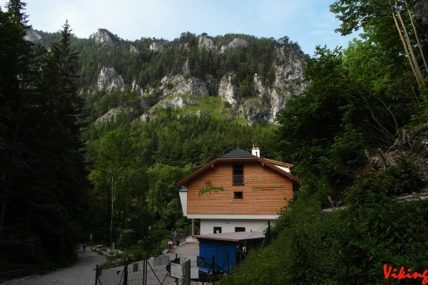 Vom Parkplatz zum Weichtalhaus. Die Klettersteige befinden sich unmittelbar neben der Hütte.