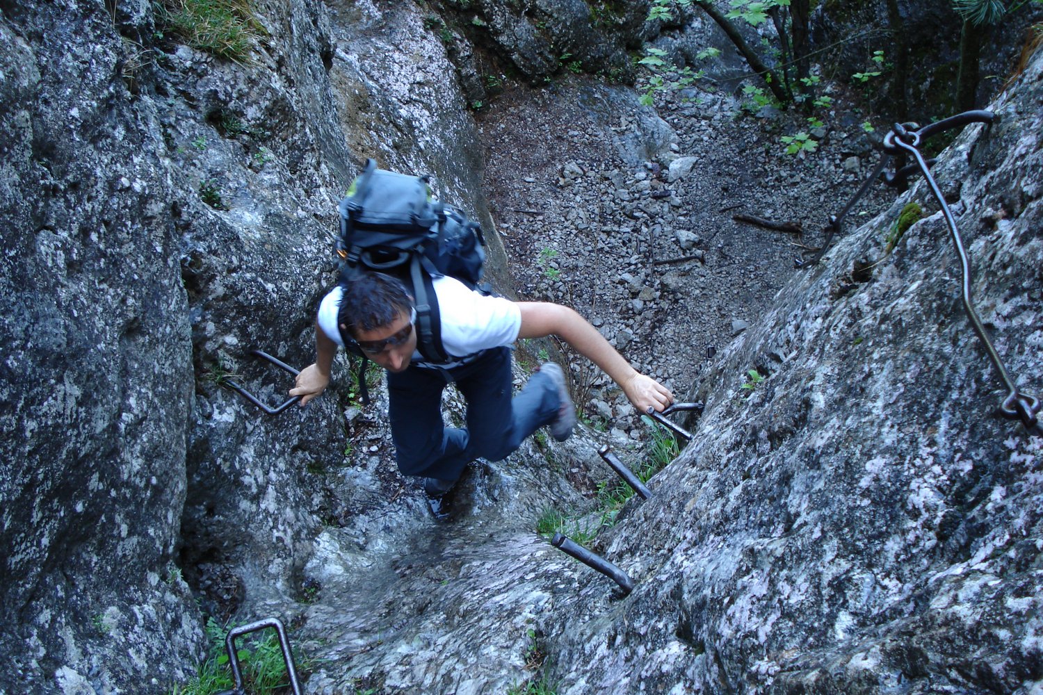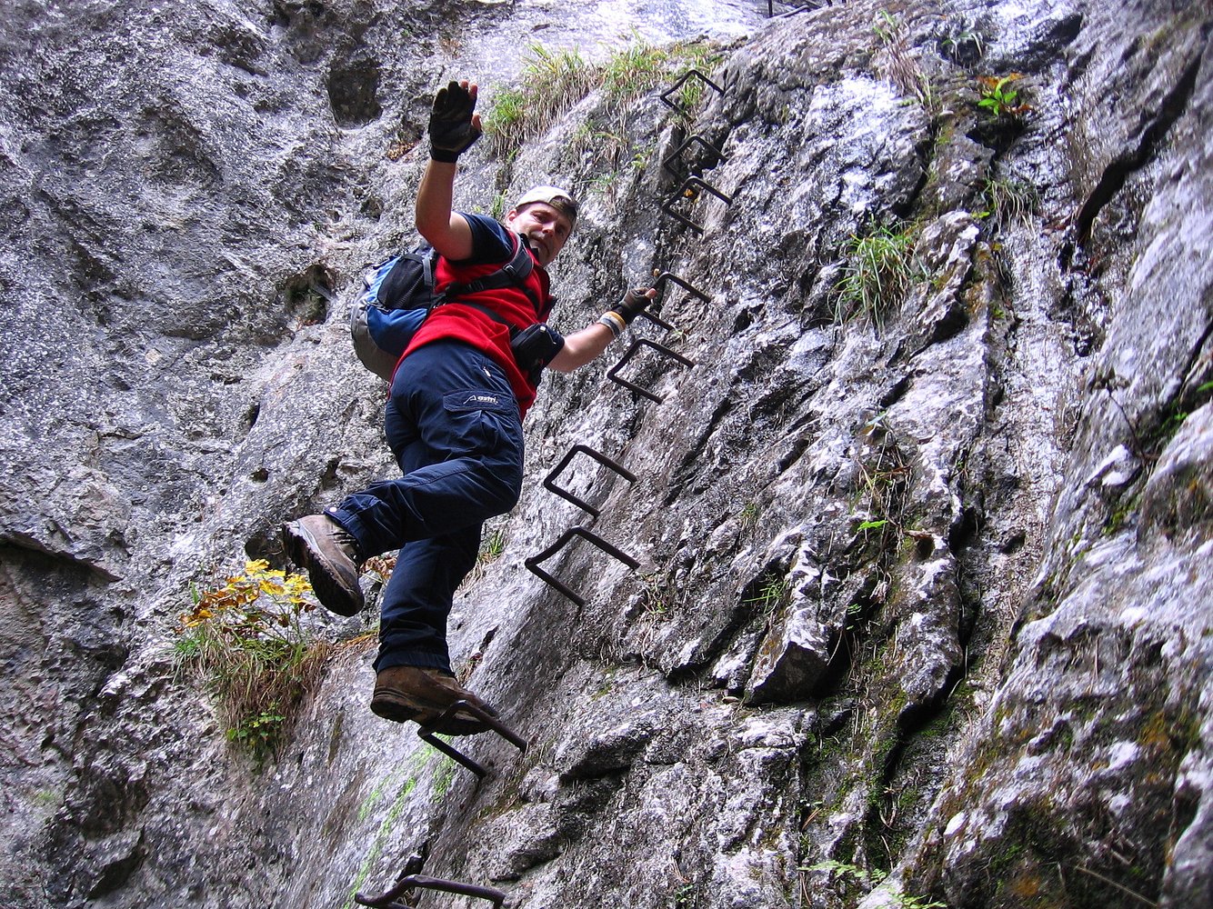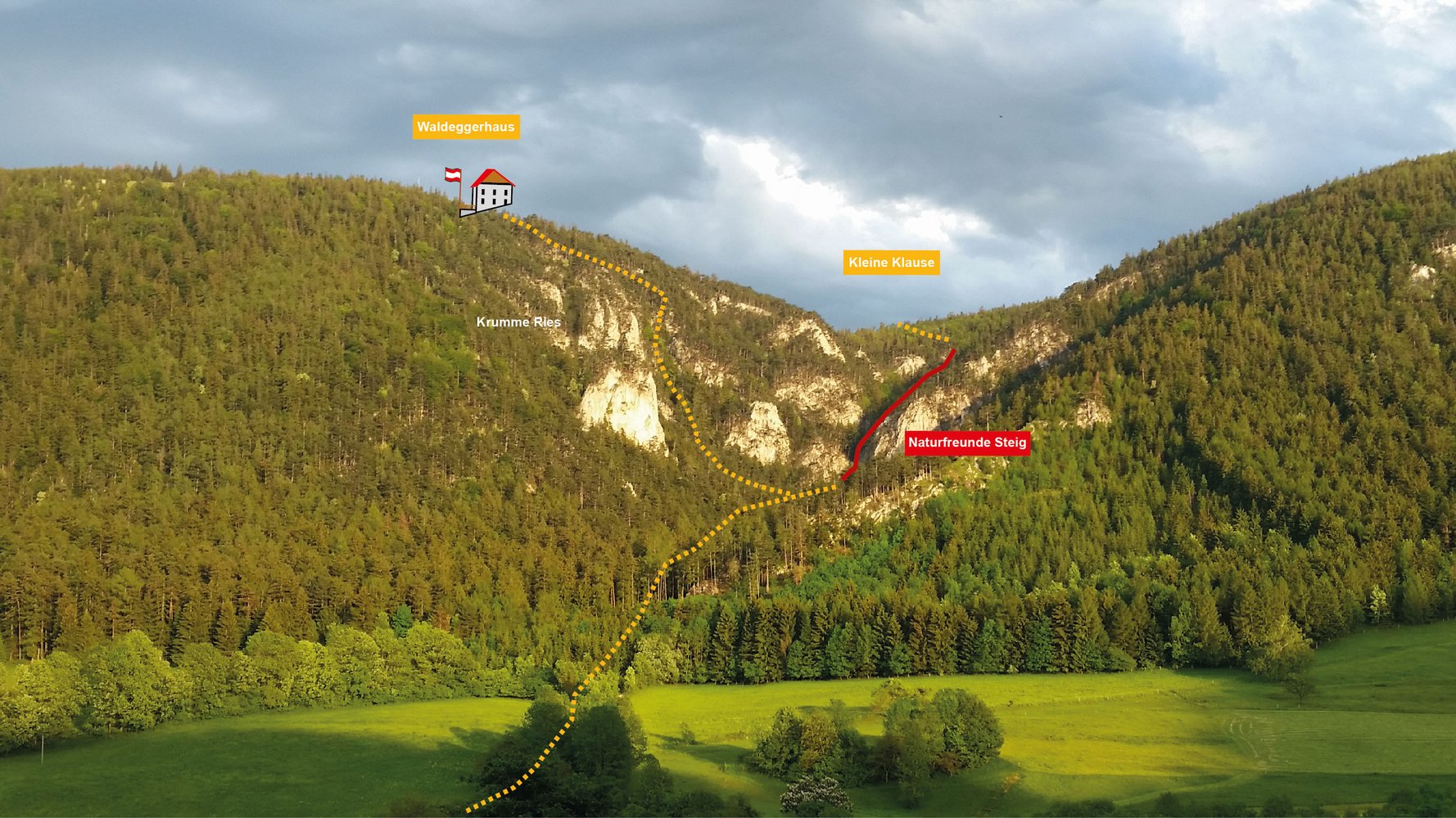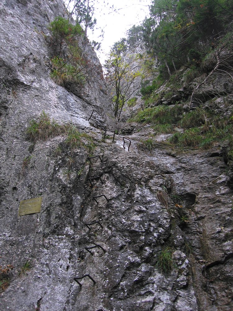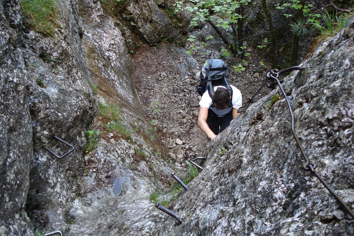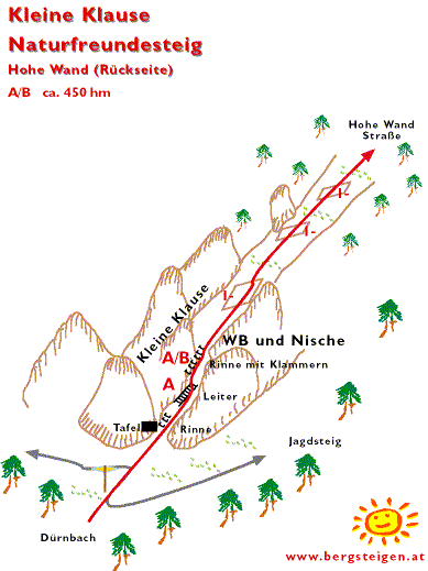 Der Naturfreundesteig durch die Kleine Klause ist in wildromantischer Romantischer und abwechslungsreicher Aufstieg durch die Kleine Klause. Der eigentliche Klettersteig-Teil beträgt rd. 50 Hm, danachfolgen noch kurze ungesicherte Stufen bis 1-/1. Es gibt kein Drahtseil, sondern Klemmen und historische Eisenstangen. ein kurzer, überaus reichlich versicherter Steig durch diesen schluchtartigen Graben.