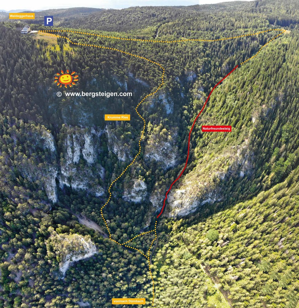 Man kann auch beim Waldeggerhaus parken und zuerst über die Krumme Ries, grün/weiße Markierung zum Einstieg absteigen.
