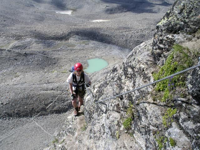 Komplette Klettersteigausrüstung (Klettersteigset mit langen Seilschwänzen empfehlenswert), Helm